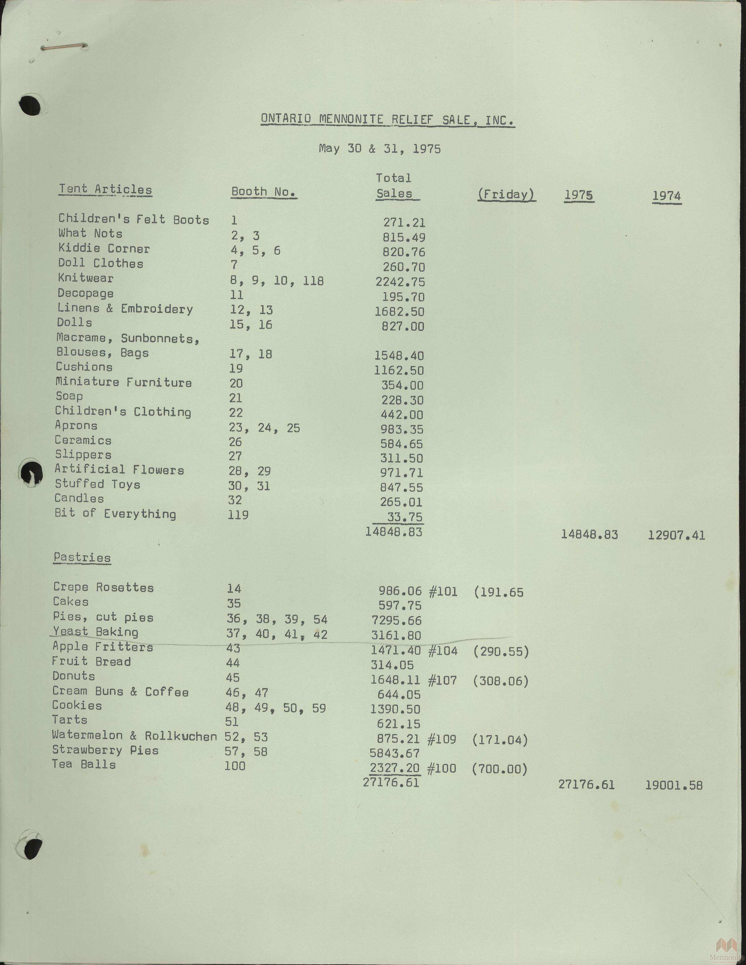 Title What was sold at the 1975 Mennonite Relief Sale, with comparisons to 1974