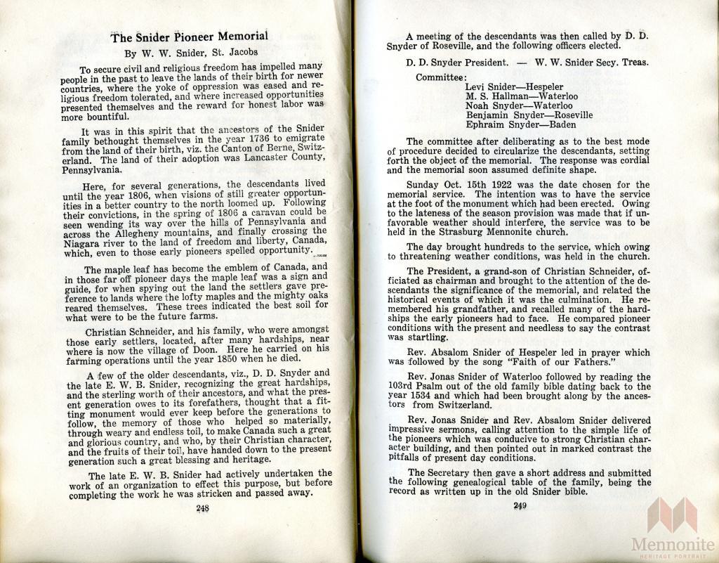 Keywords Christian Schneider; Elizabeth Erb; Doon, Waterloo County; forestland; Canton of Berne Switzerland; Lancaster County, Pennsylvania; Mennonite service; Mennonite memorial; Mennonite memorials