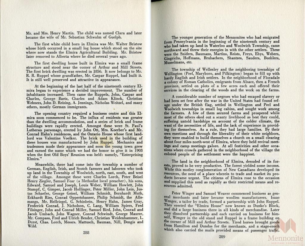 Keywords town; towns; Elmira; Waterloo County; Canagagigue River; crossroads; Arthur; Guelph-Elmira gravel road; church; churches; Mennonite; Lutheran; Roman Catholic; public school; public schools; hotel; hotels; gristmill; gristmills; potashery; potasheries; saddler; saddlers; shoemaker; shoemakers; cooper; coopers, blacksmith; blacksmiths; carpenter; carpenters, mason; masons; tailor; tailors; tinsmith; tinsmiths; dressmaker; dressmakers; milliner; milliners.