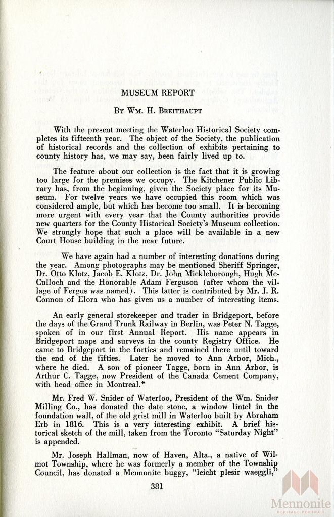 Accession Data Fifteenth Annual Report of the Waterloo Historical Society, 1927, Page 381-382.