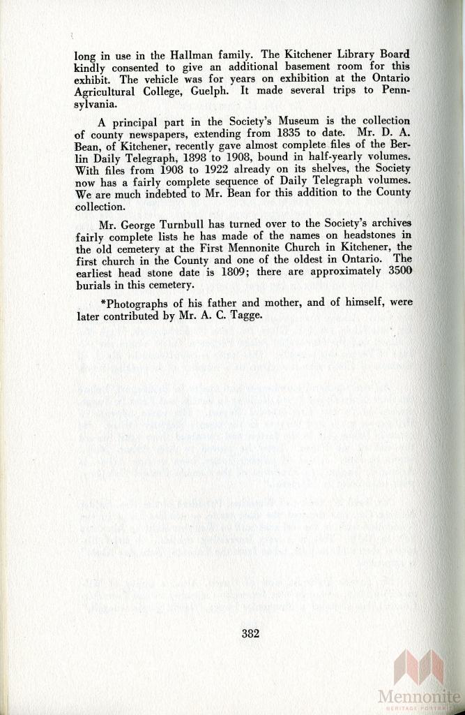 Accession Data Fifteenth Annual Report of the Waterloo Historical Society, 1927, Page 381-382.
