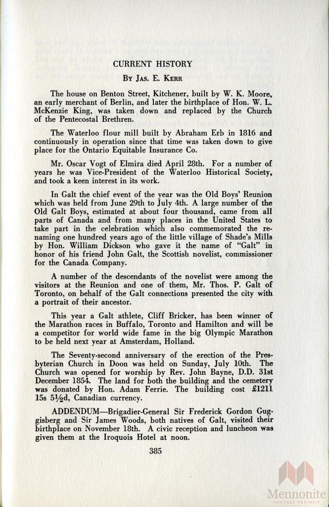 Accession Data Fifteenth Annual Report of the Waterloo Historical Society, 1927, Page 385-386.