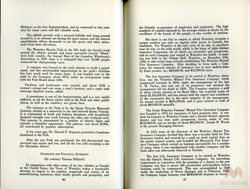 Keywords City of Waterloo; Village of Waterloo; Abraham Erb; Jacob C. Snider; native; natives; Mennonite; Mennonite; German; Germans; water; public square; public squares; church; churches; school; schools; park; parks; insurance; insurance company; insurance companies; band; bands; music; market; markets; cow; cows; chicken; chickens; pig; pigs; butcher; butchers; butchering; fireman; firemen; soldier; soldiers; World War I