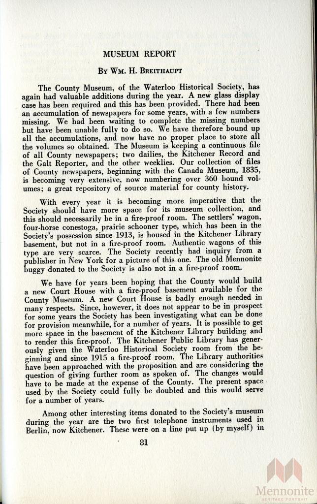 Keywords Waterloo County Museum; Waterloo Historical Society; fire-proof room; fire-proof rooms; Kitchener Public library; newspaper; newspapers; collection; collections; local telephone directory; local telephone directories