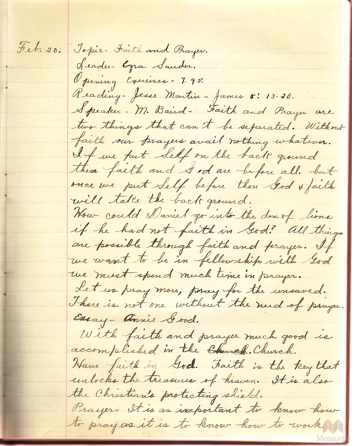 Keywords St. Jacobs Mennonite Church, Young People's Bible Meeting, Jesse Martin, M. Baird, Annie Good, Abner Good.