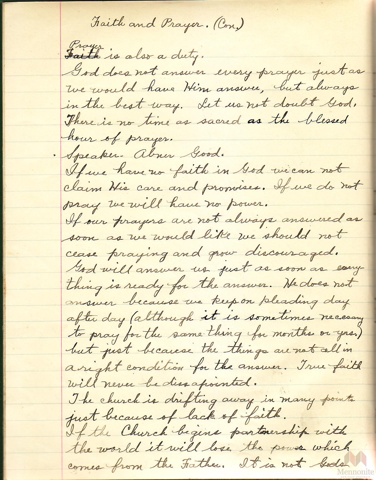 Keywords St. Jacobs Mennonite Church, Young People's Bible Meeting, Jesse Martin, M. Baird, Annie Good, Abner Good.