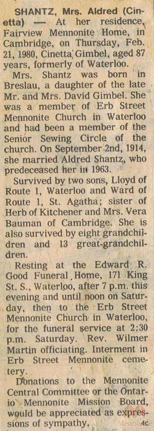 Keywords Gimbel, Shantz, Cinetta Gimbel, Cinetta Shantz, Erb St. Mennonite