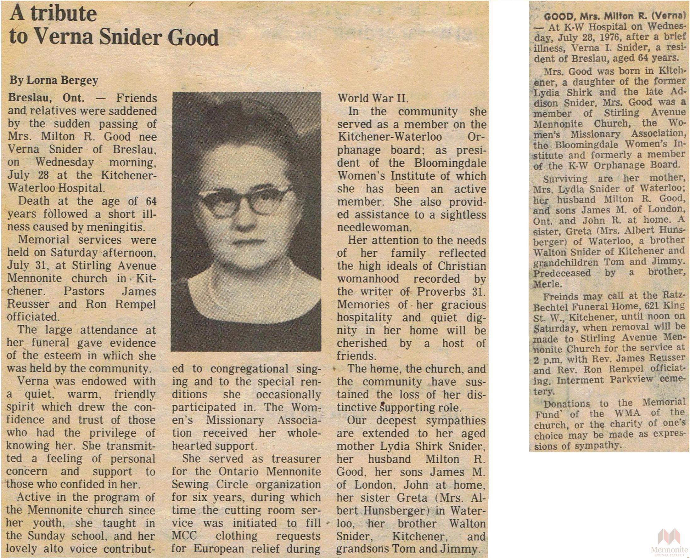 Keywords Good, Snider, Verna Good, Verna Snider, Lorna Bergey, Stirling Avenue Mennonite Church, Rev. James Reusser, Rev. Ron Rempel, Parkview Cemetery