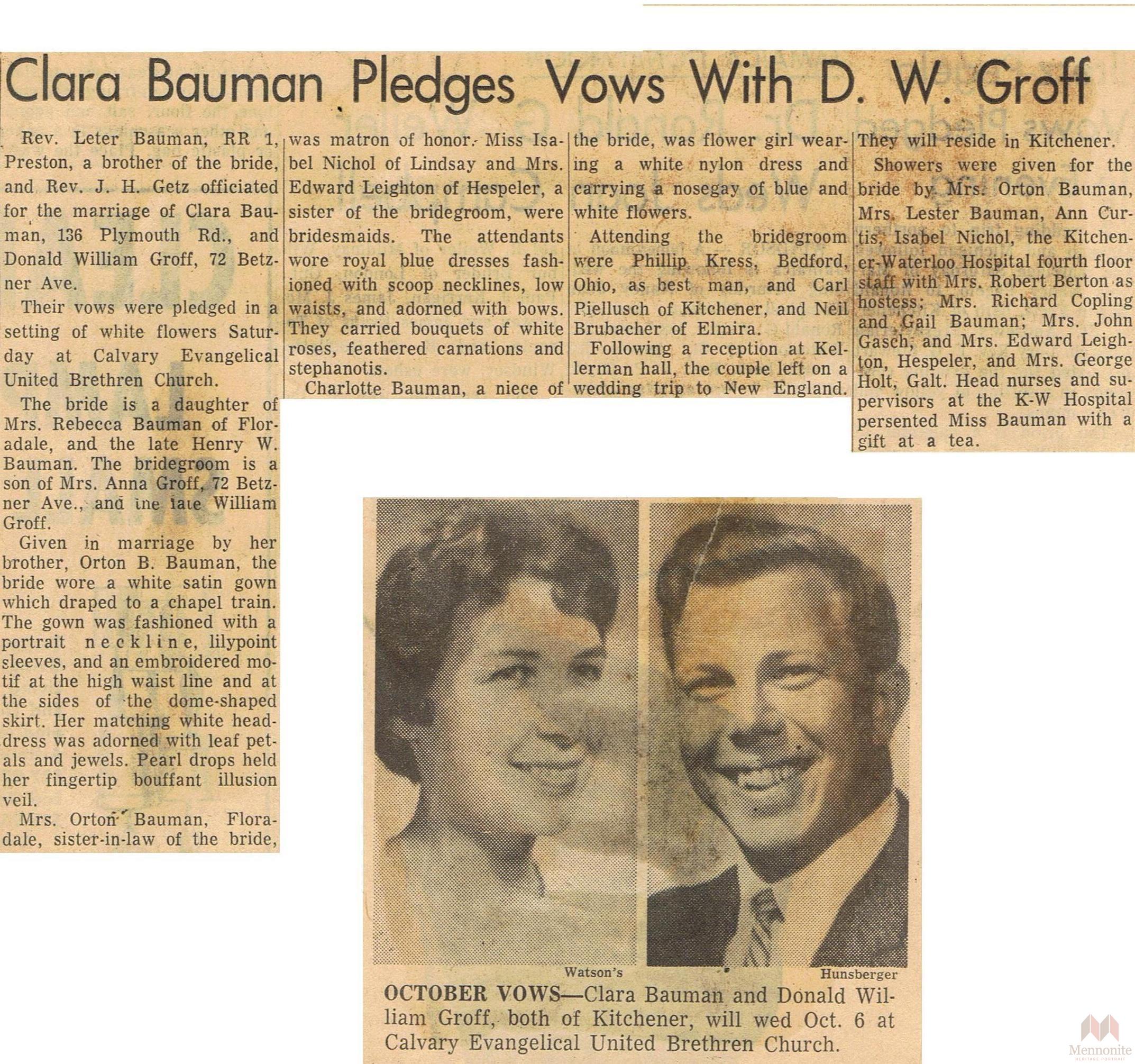 Title Clara Bauman Pledges Vows With D. W. Groff