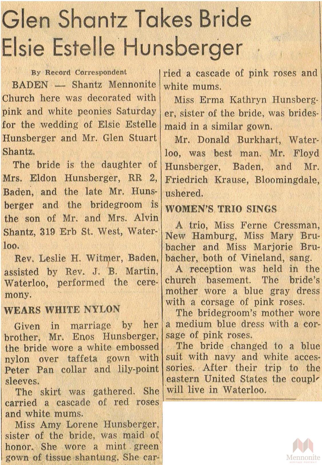 Keywords Hunsberger, Shantz, Elsie Hunsberger, Elsie Shantz, Glen S. Shantz, Shantz Mennonite Church, Rev. Leslie H. Witmer, Rev. J. B. Martin