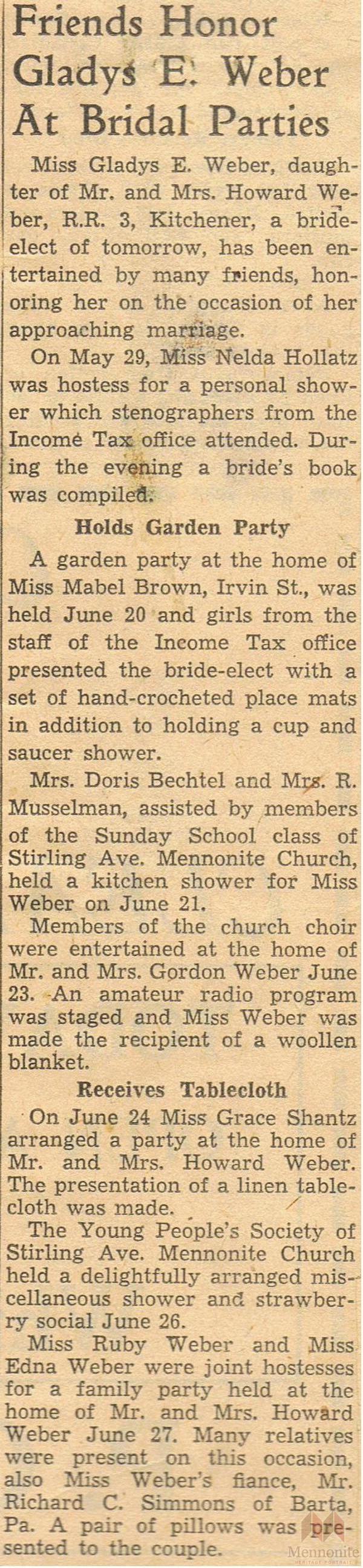 Keywords Weber, Simmons, Gladys Weber, Gladys Simmons, Richard Simmons, Stirling Avenue Mennonite Church