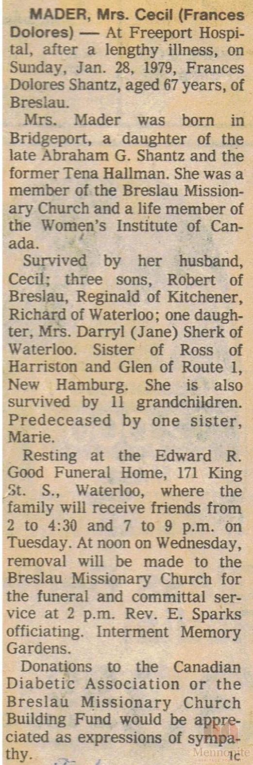 Keywords Mader, Shantz, Frances Dolores Shantz, Frances Dolores Mader, Breslau United Missionary Church, Breslau Missionary Church, Rev. E. Sparks, Memory Gardens