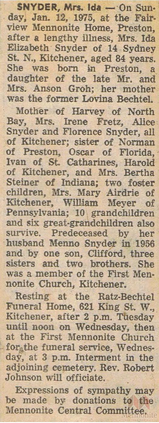 Keywords Snyder, Groh, Ida Groh, Ida Snyder, First Mennonite Cemetery, First Mennonite Church, Rev. Robert Johnson