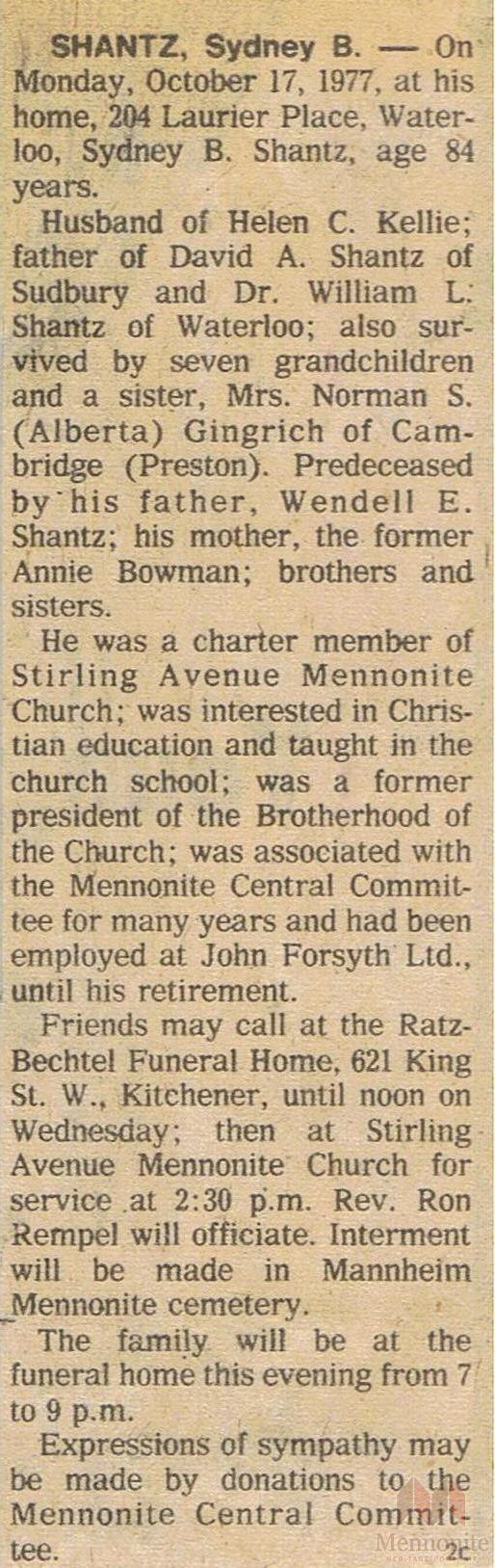 Keywords Shantz, Sydney B. Shantz, Stirling Avenue Mennonite Church, Mannheim Mennonite Cemetery