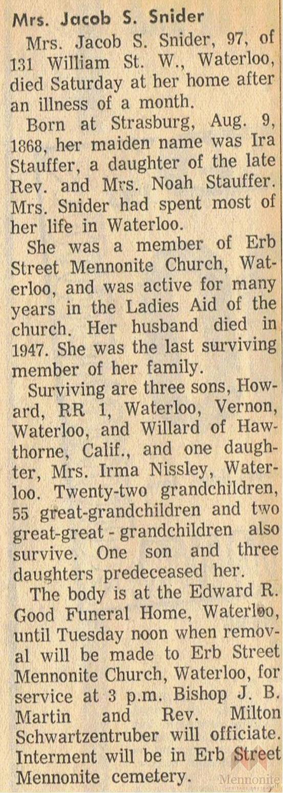 Keywords Snider, Stauffer, Ida Stauffer, Ida Snider, Rev. J. B. Martin, Rev. Milton Schwartzentruber, Erb Street Mennonite Church, Erb Street Mennonite Cemetery