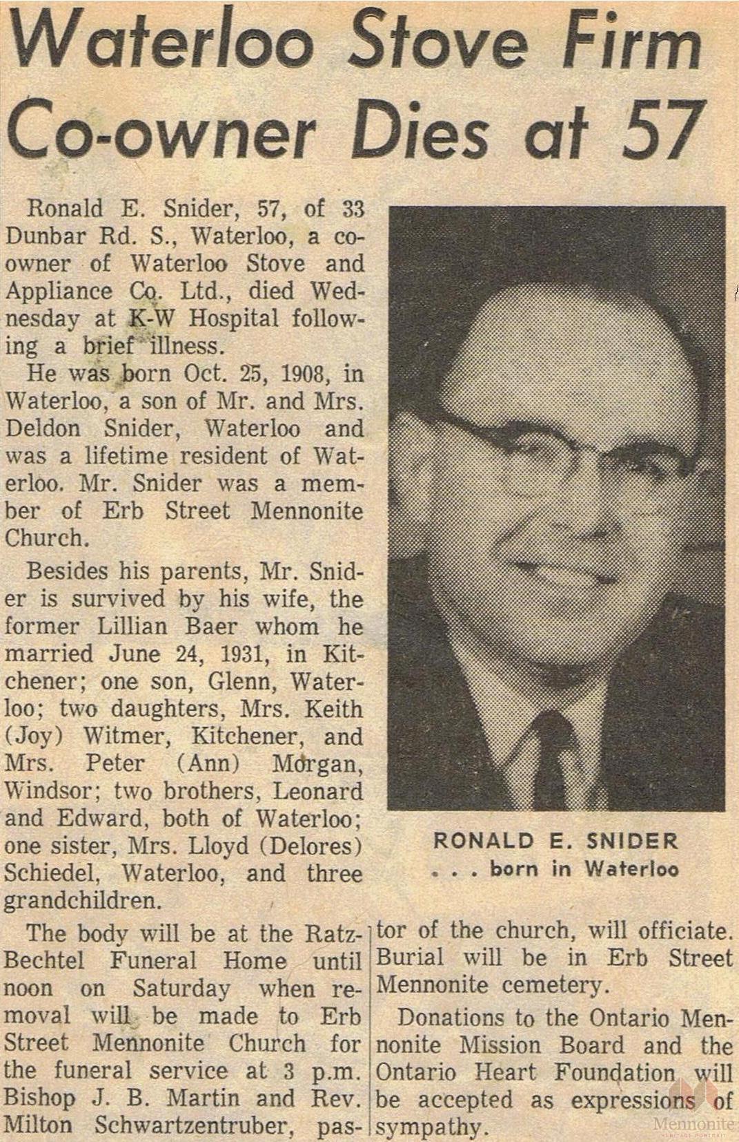 Keywords Snider, Ronald E. Snider, Erb Street Mennonite Church, Erb Street Mennonite Cemetery, Rev. Milton Schwartzentruber, Bishop J. B. Martin