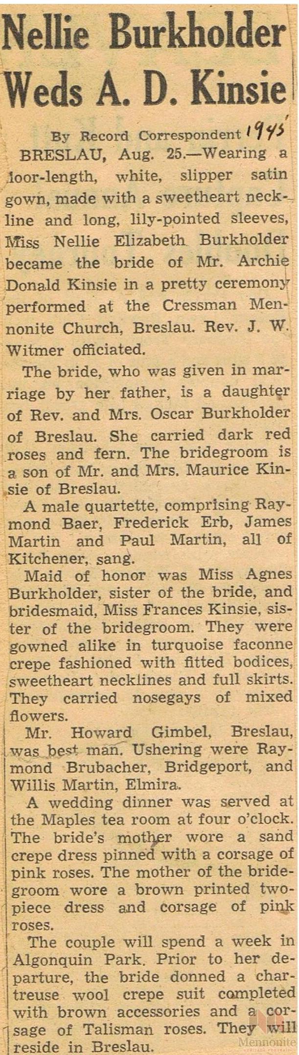 Keywords Kinsie, Burkholder, Cressman Mennonite Church, Breslau Mennonite Church, Rev. J.W. Witmer, Rev. J. Wesley Witmer, Archie Kinsie, Nellie Kinsie, Nellie Burkholder