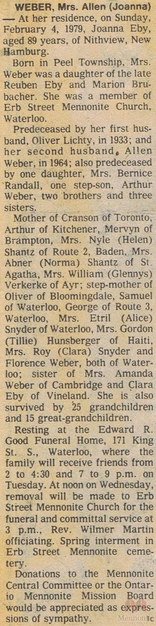 Keywords Joanna Eby, Joanna Lichty, Joanna Weber, Erb Street Mennonite Church, Rev. Wilmer Martin