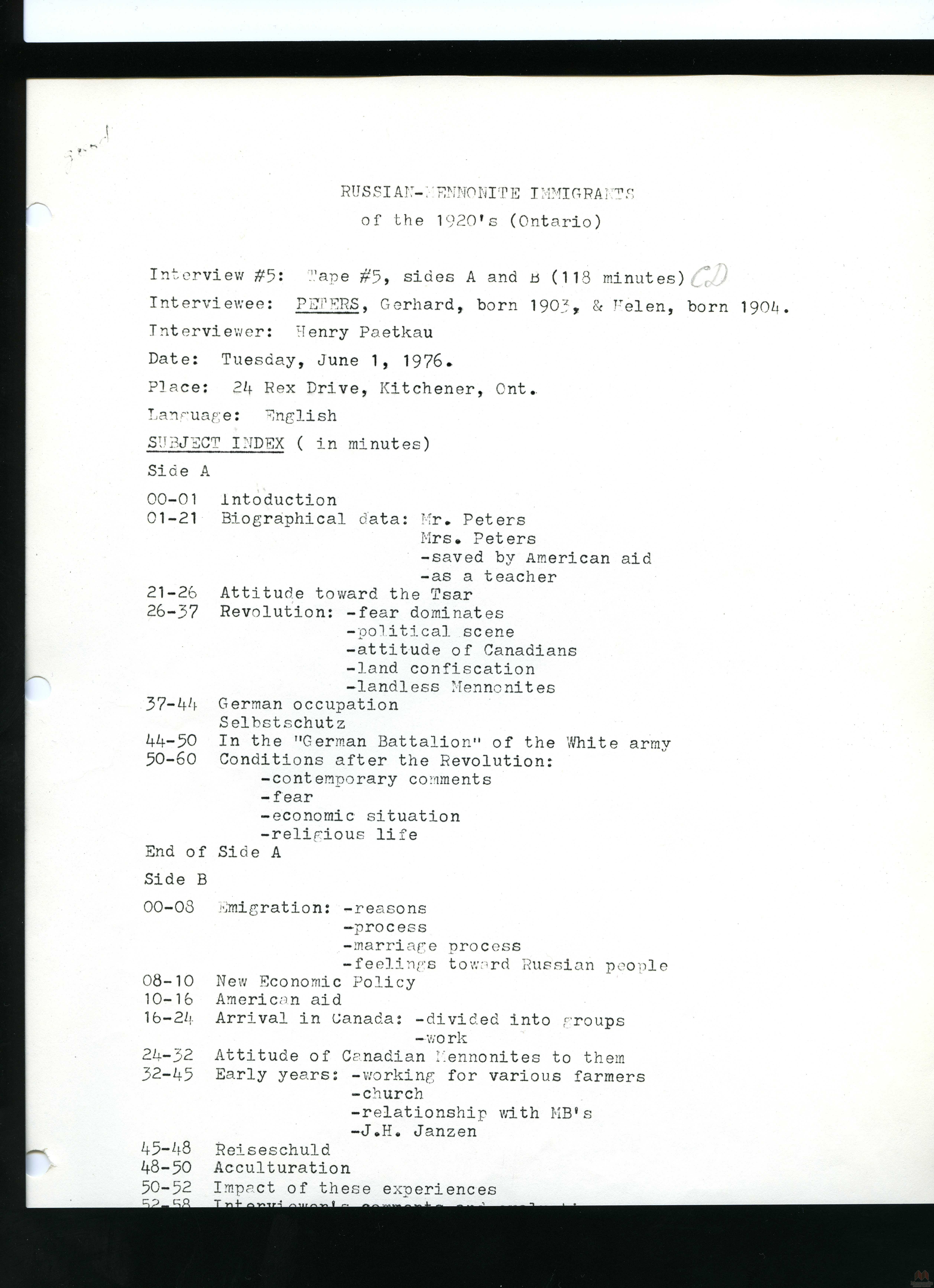 Keywords Mennonite, Russia, Russian, emigration, interview, oral, history, immigration, immigrants, Canada, Ontario, 1920s, transcript, Gerhard Peters, Helen Peters,