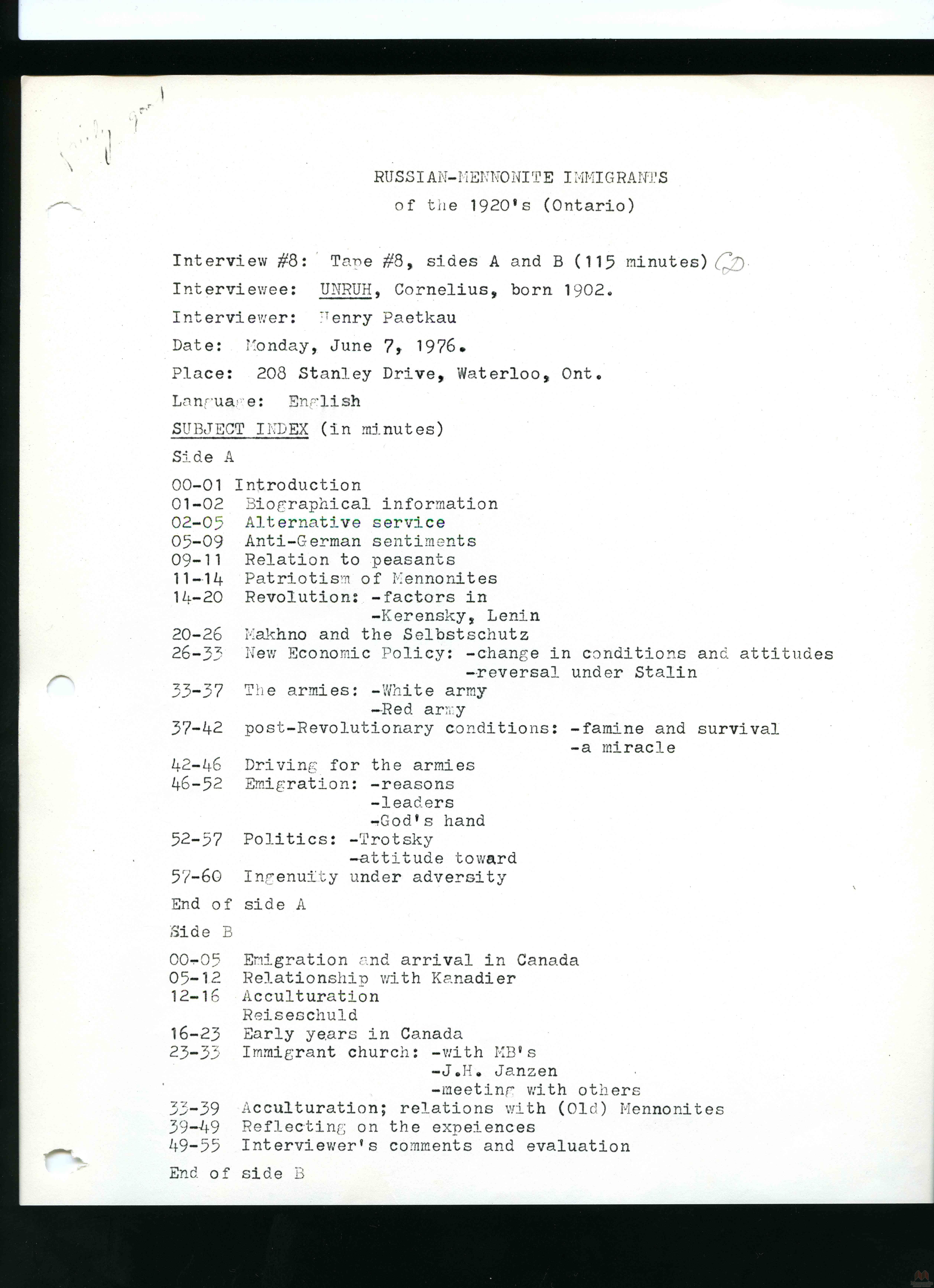 Keywords Mennonite, Russia, Russian, emigration, interview, oral, history, immigration, immigrants, Canada, Ontario, 1920s, transcript, Cornelius, Unruh,