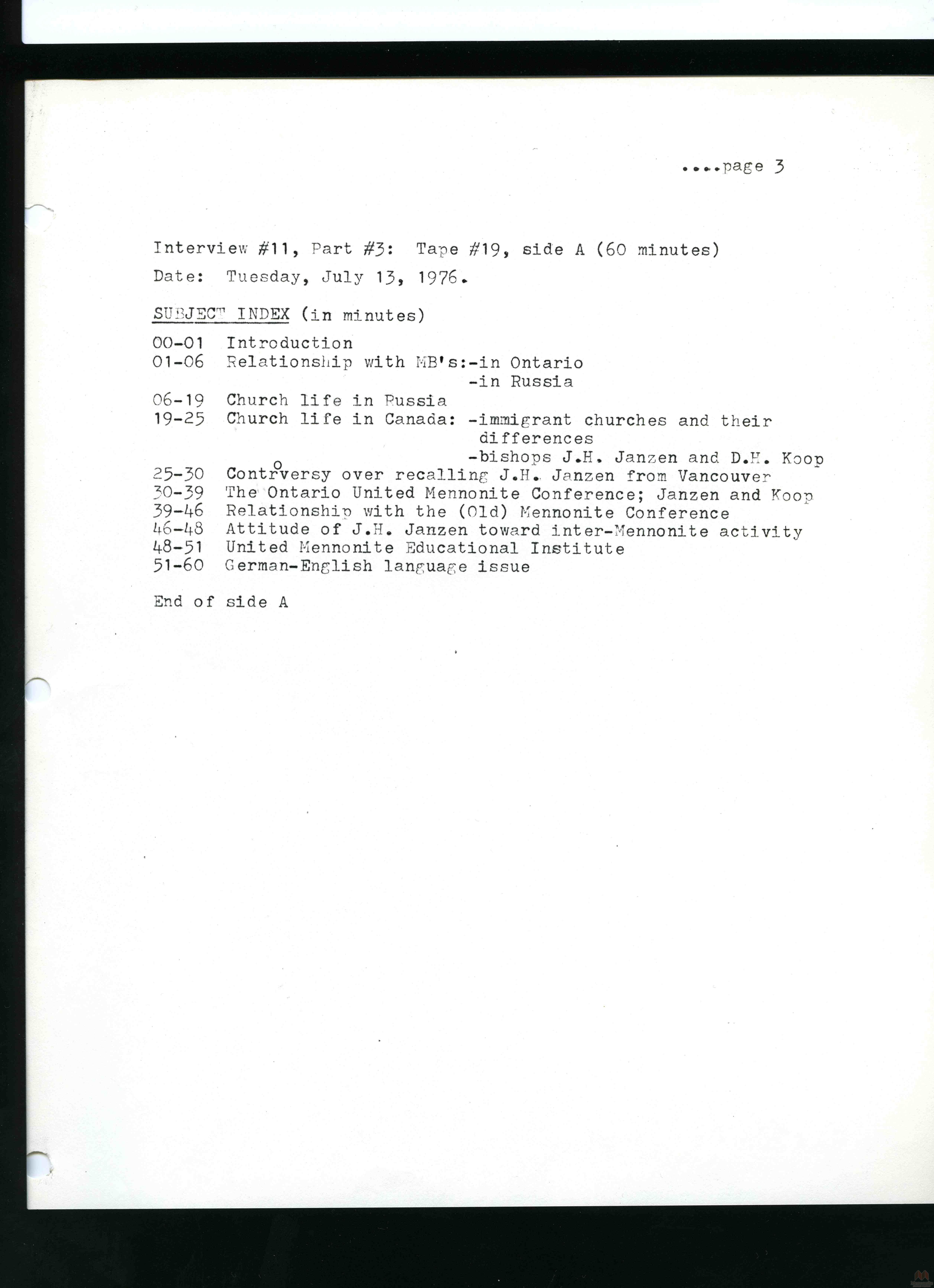 Finding Aid #1 - Oral History - Russian Mennonite Migration - 1920's