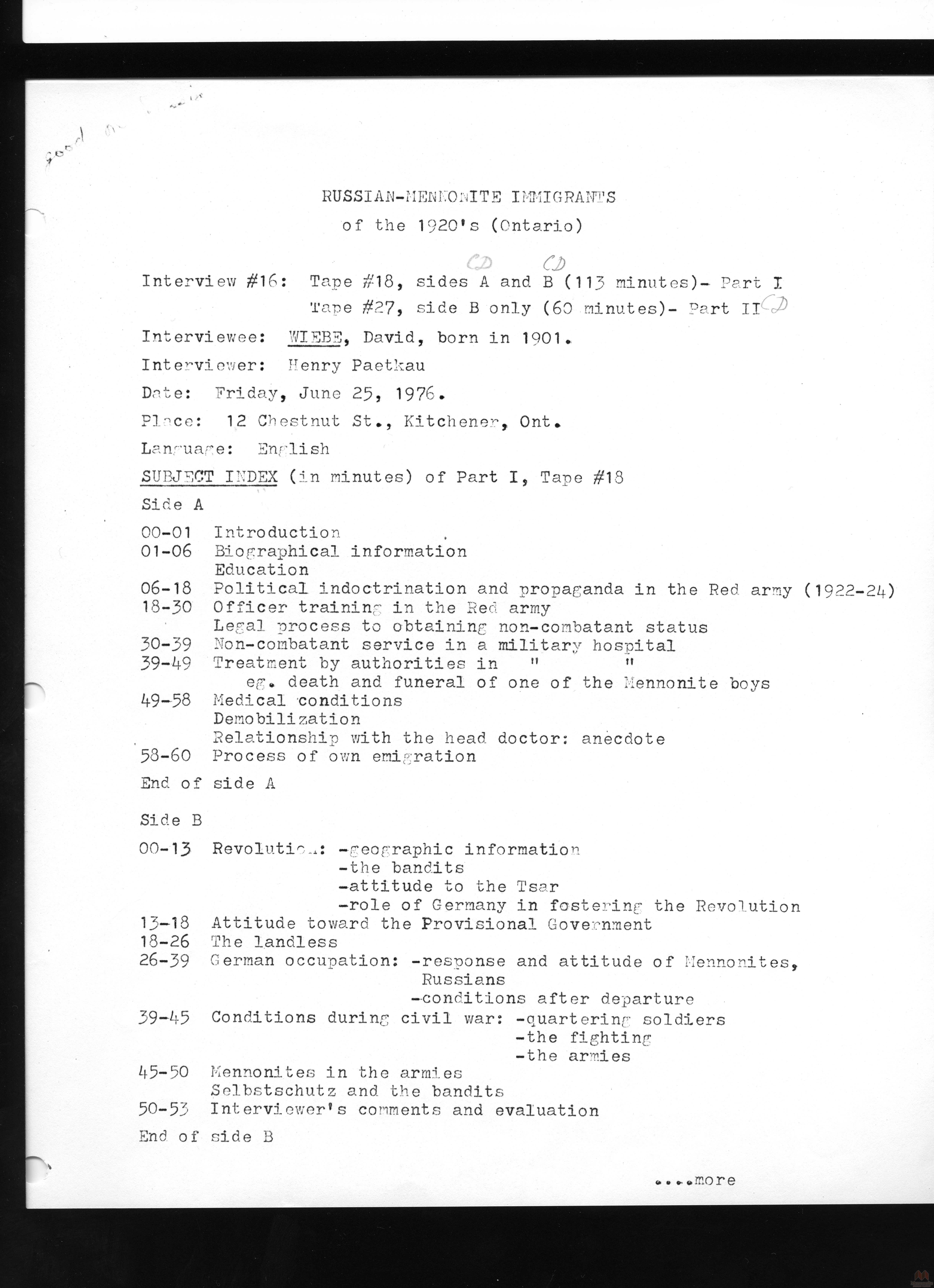 Keywords Mennonite, Russia, Russian, emigration, interview, oral, history, immigration, immigrants, Canada, Ontario, 1920s, transcript, David Wiebe,
