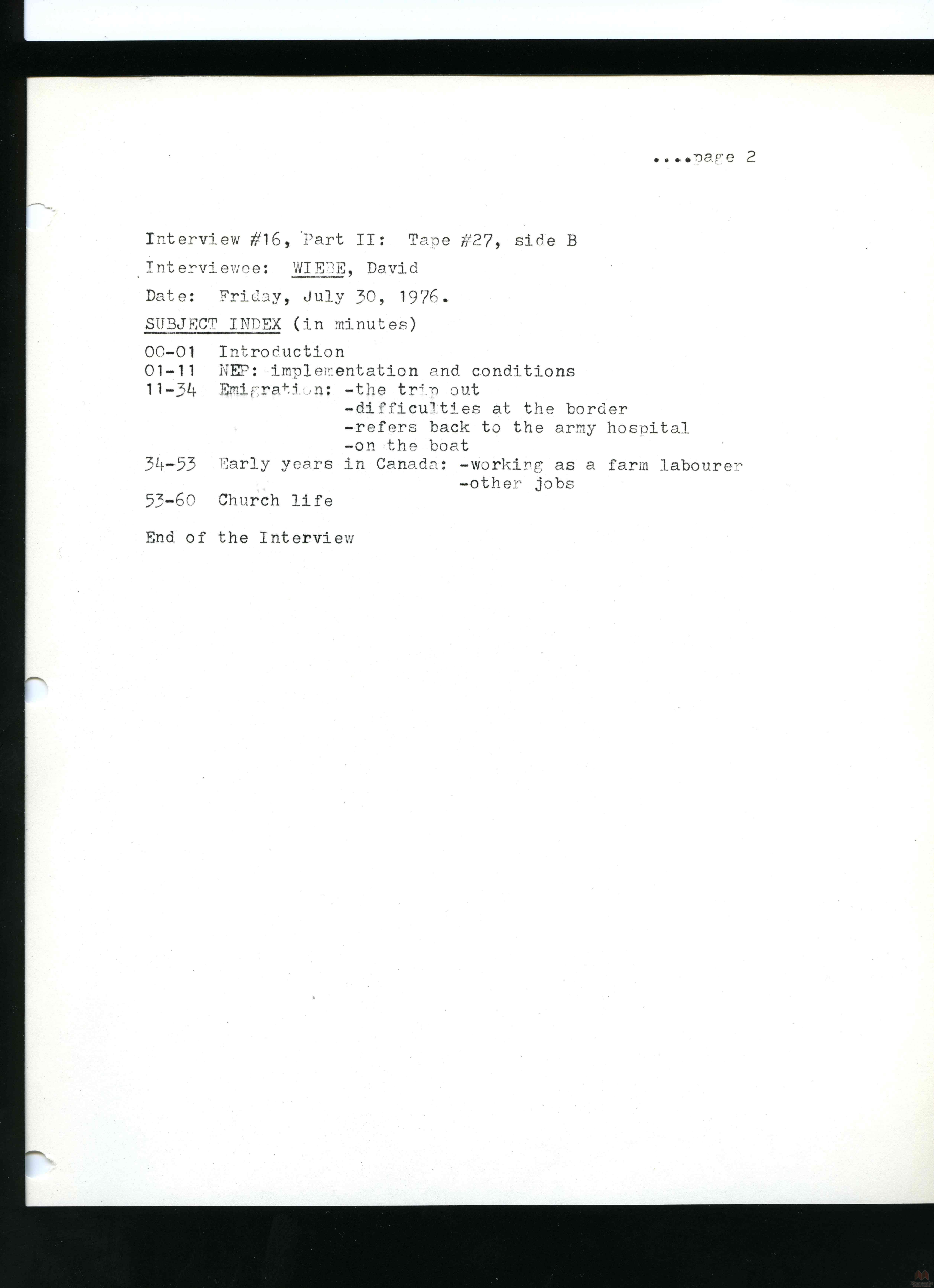 Keywords Mennonite, Russia, Russian, emigration, interview, oral, history, immigration, immigrants, Canada, Ontario, 1920s, transcript, David Wiebe,