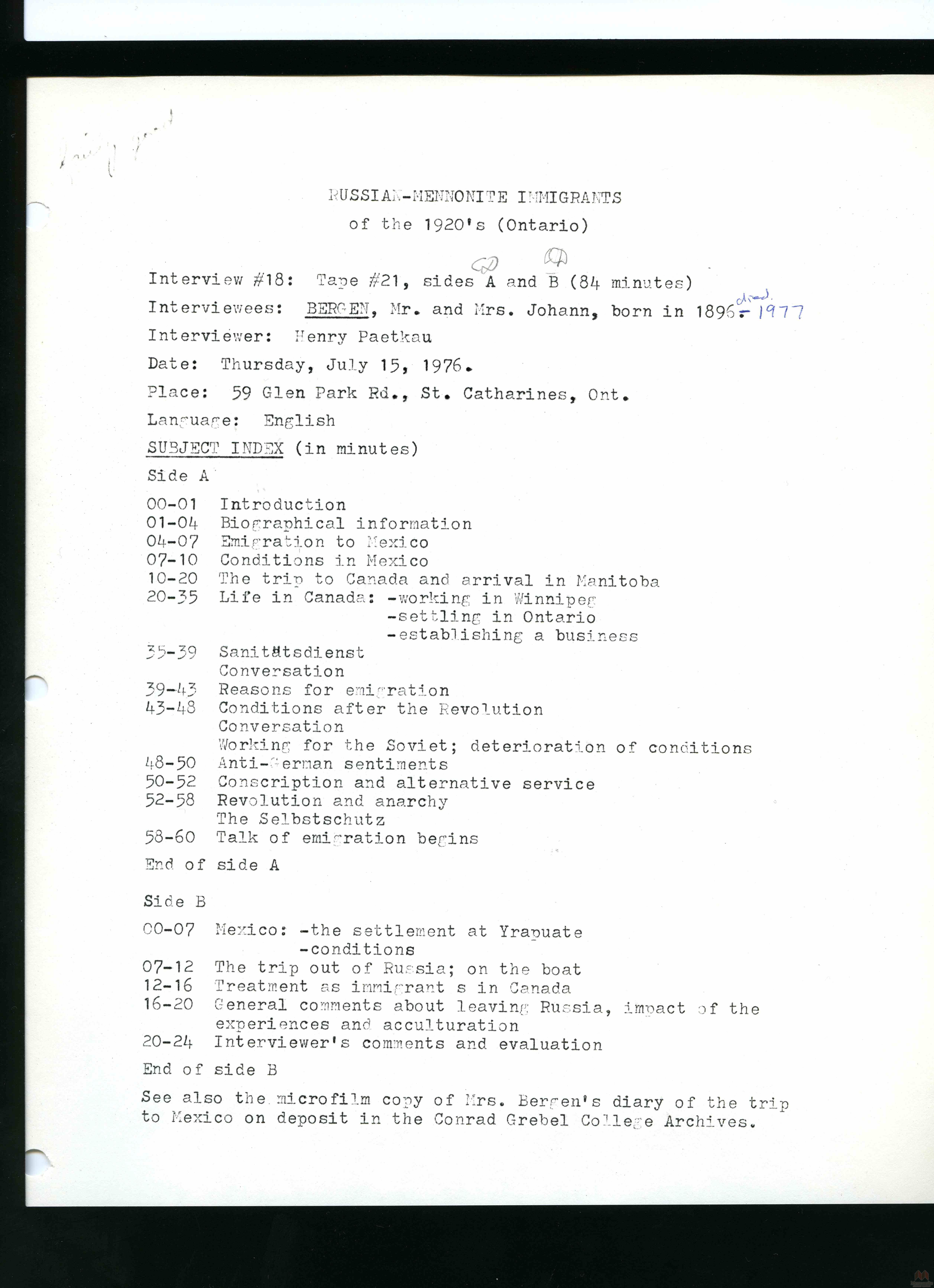 Keywords Mennonite, Russia, Russian, emigration, interview, oral, history, immigration, immigrants, Canada, Ontario, 1920s, transcript, Mr. Johann Bergen, Mrs. Johann Bergen,