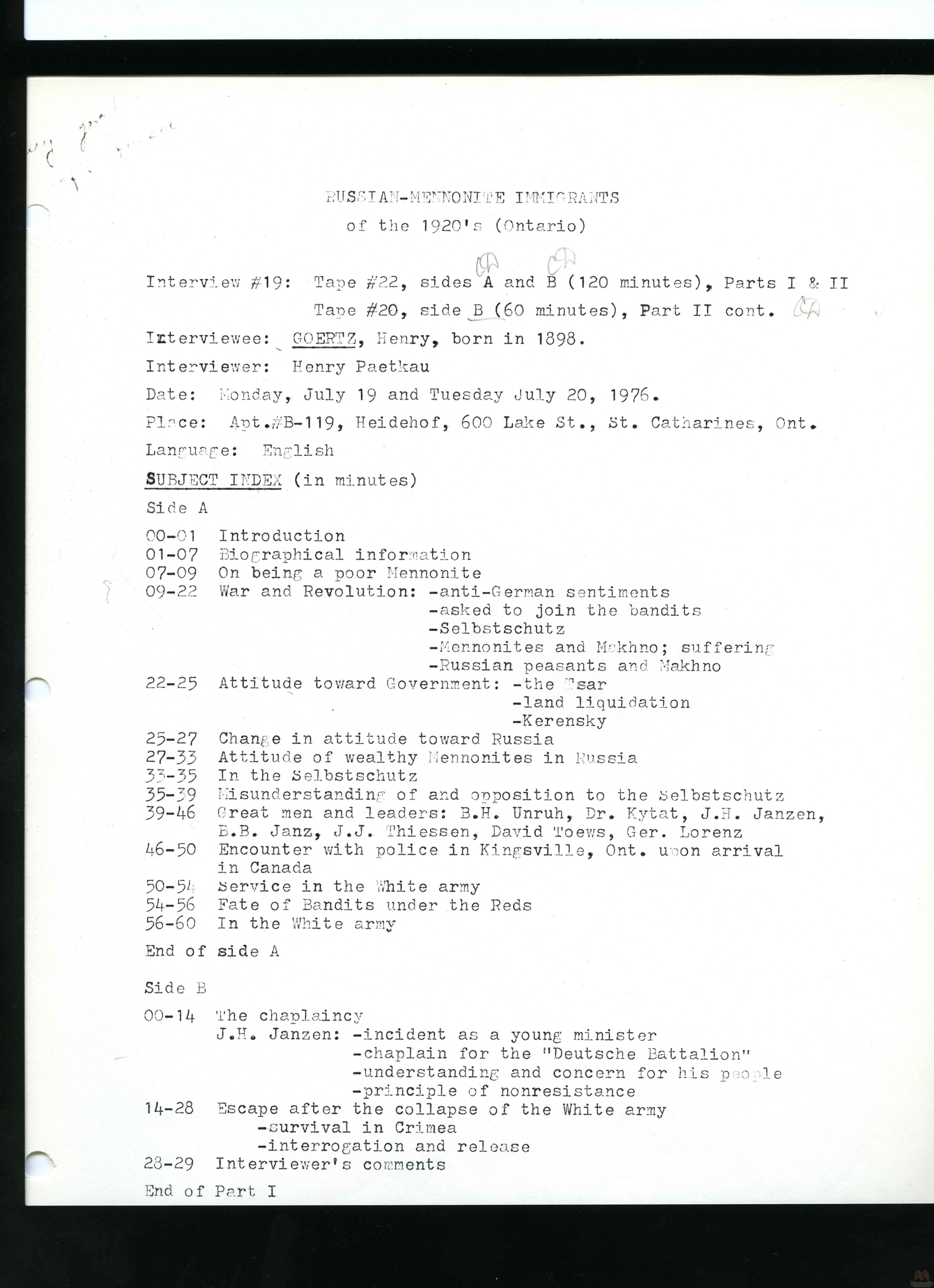 Keywords Mennonite, Russia, Russian, emigration, interview, oral, history, immigration, immigrants, Canada, Ontario, 1920s, transcript, Henry Goertz,