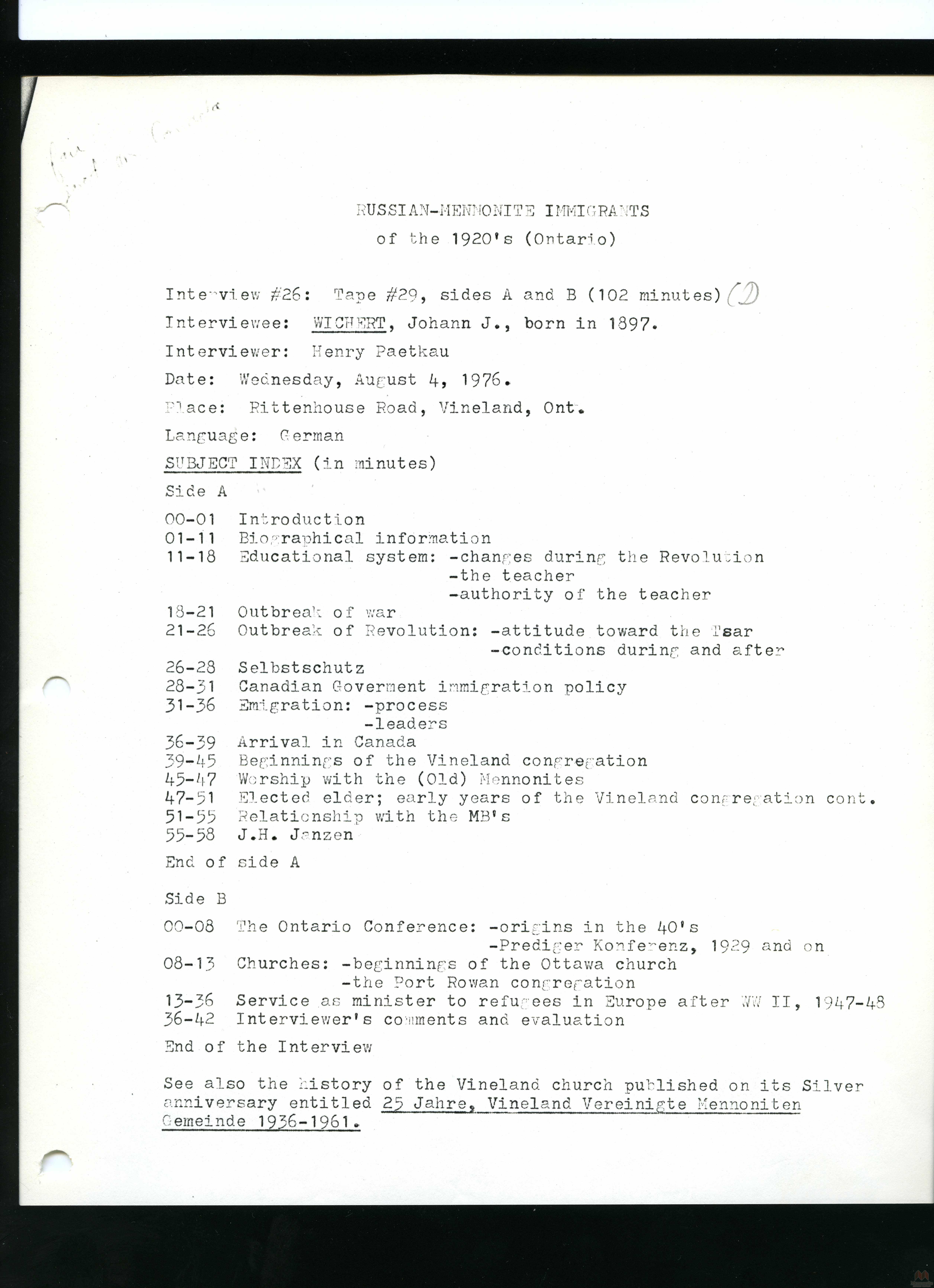 Finding Aid #1 - Oral History - Russian Mennonite Migration - 1920's