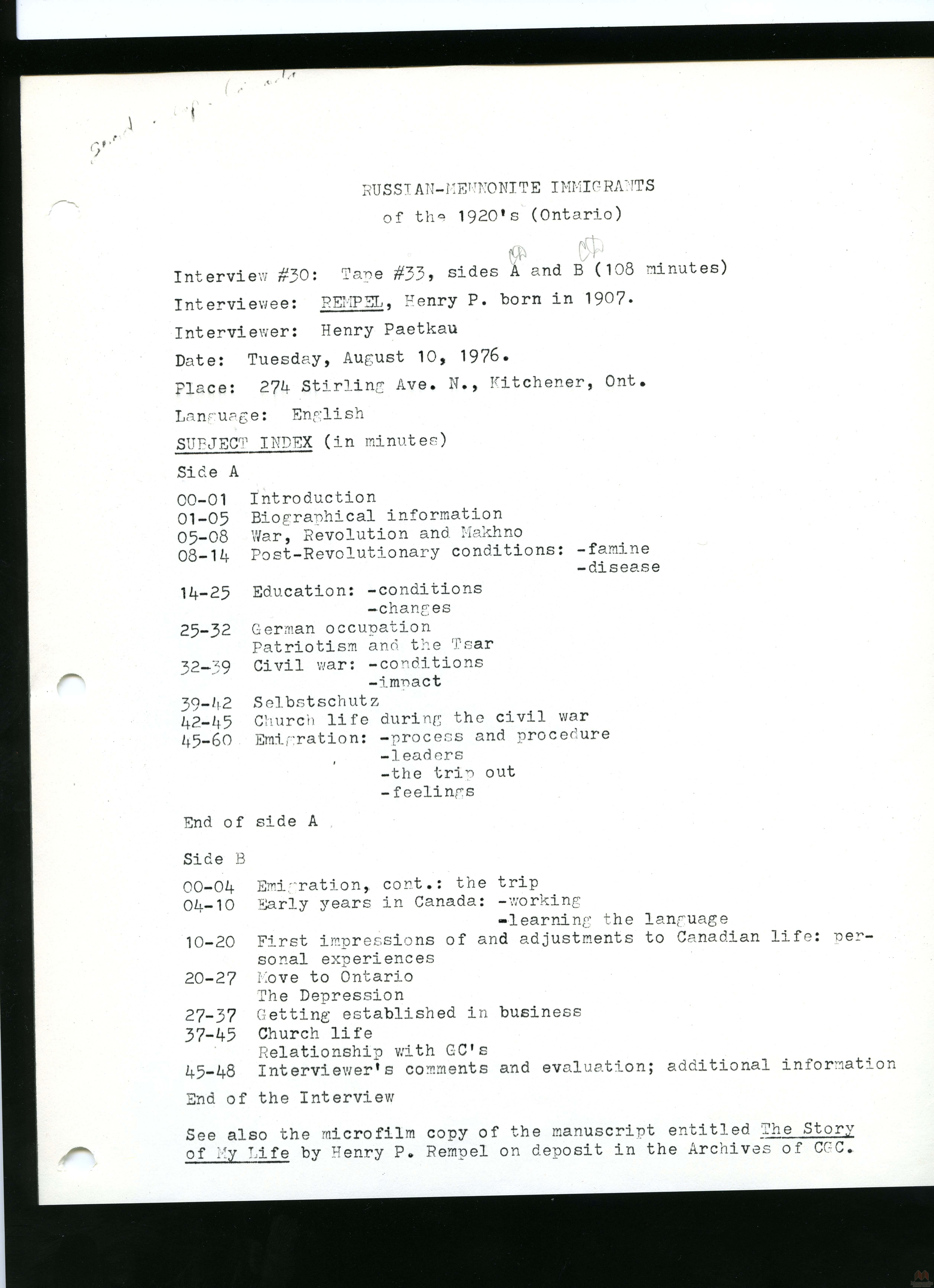 Keywords Henry P. Rempel, Mennonite, Russia, Russian, emigration, interview, oral, history, immigration, immigrants, Canada, Ontario, 1920s, transcript,