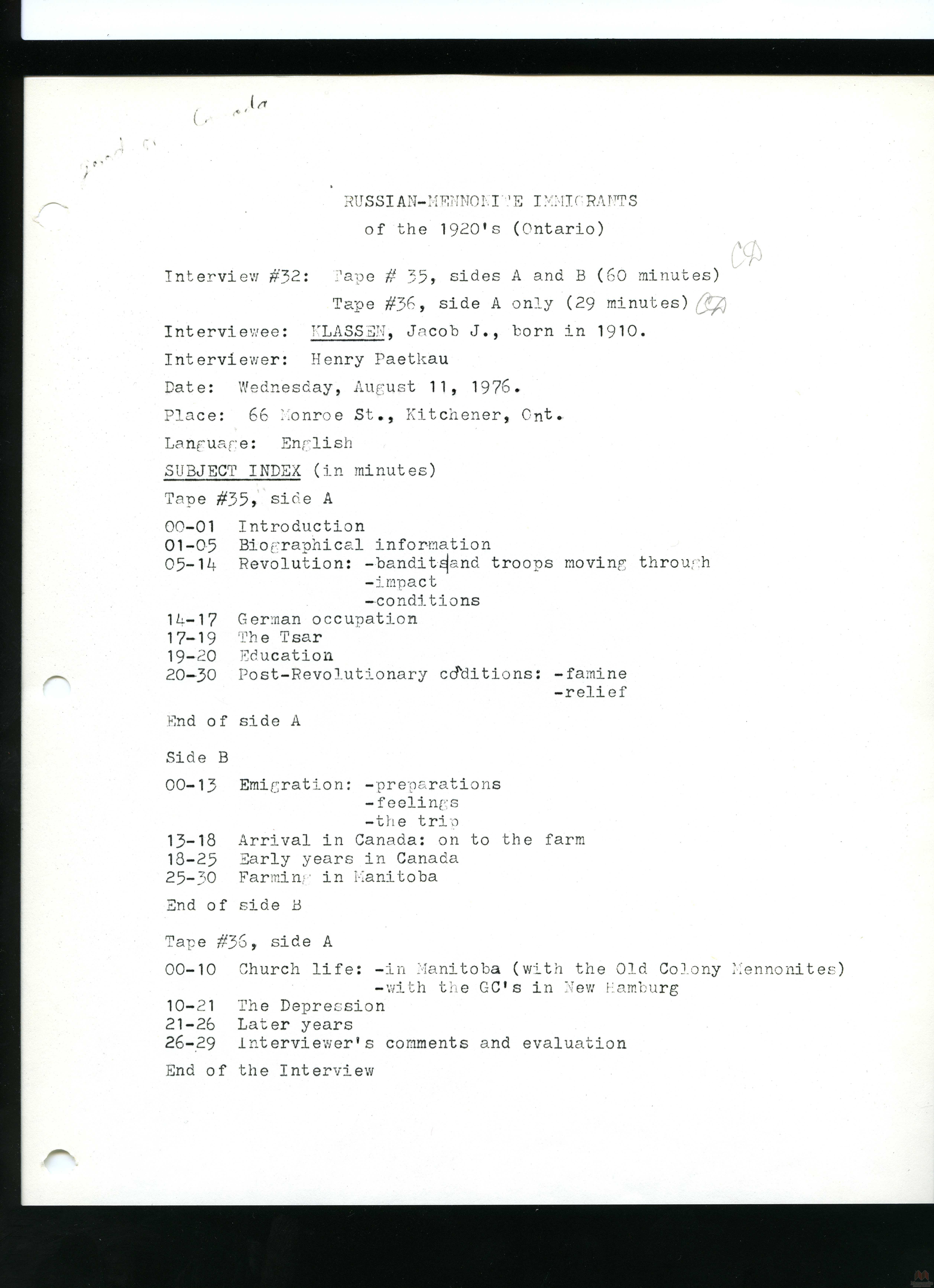 Keywords Mennonite, Russia, Russian, emigration, interview, oral, history, immigration, immigrants, Canada, Ontario, 1920s, transcript, Jacob J. Klassen,