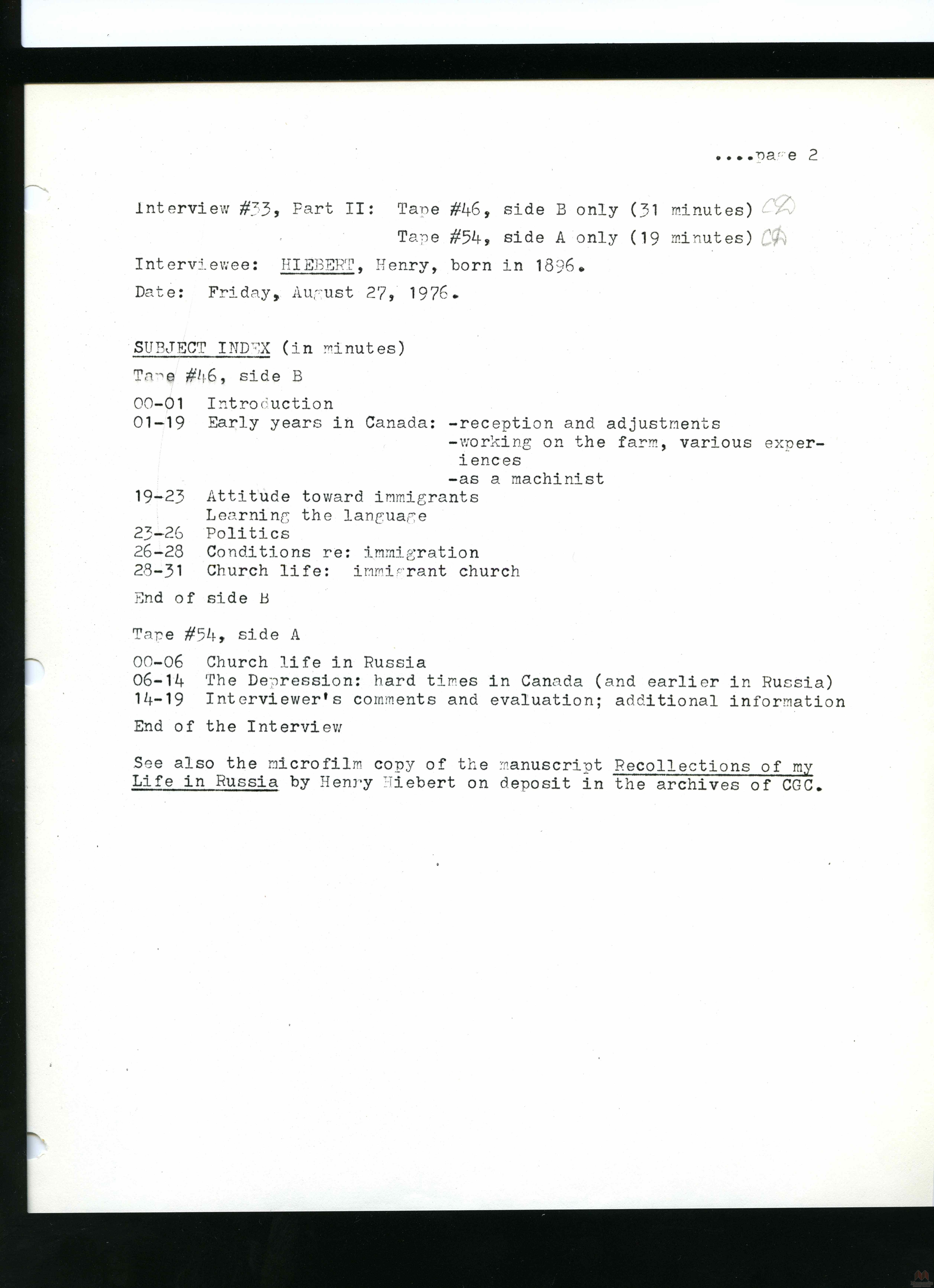 Keywords Henry Hiebert, Mennonite, Russia, Russian, emigration, interview, oral, history, immigration, immigrants, Canada, Ontario, 1920s, transcript