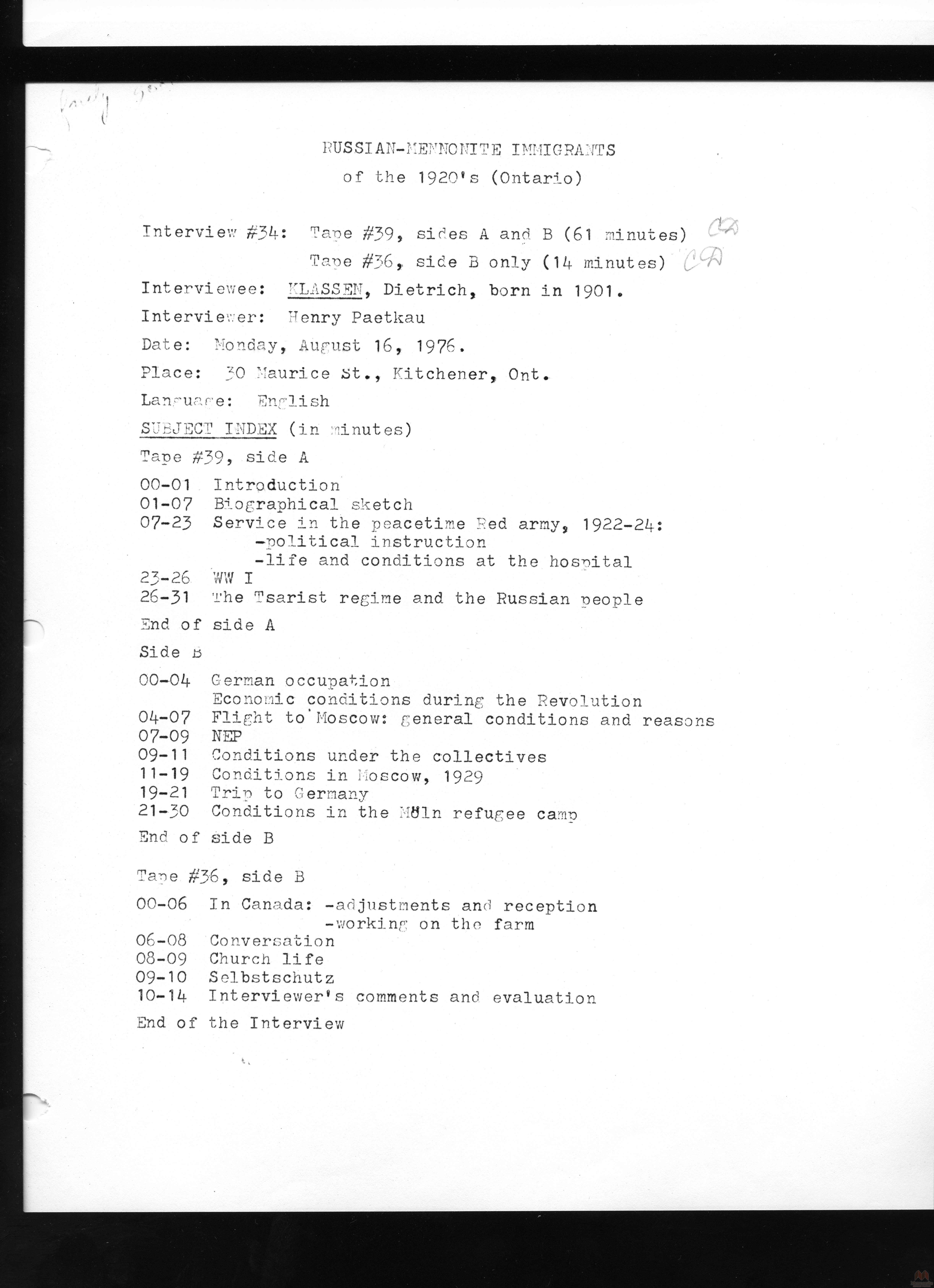 Keywords Mennonite, Russia, Russian, emigration, interview, oral, history, immigration, immigrants, Canada, Ontario, 1920s, transcript, Dietrich Klassen,