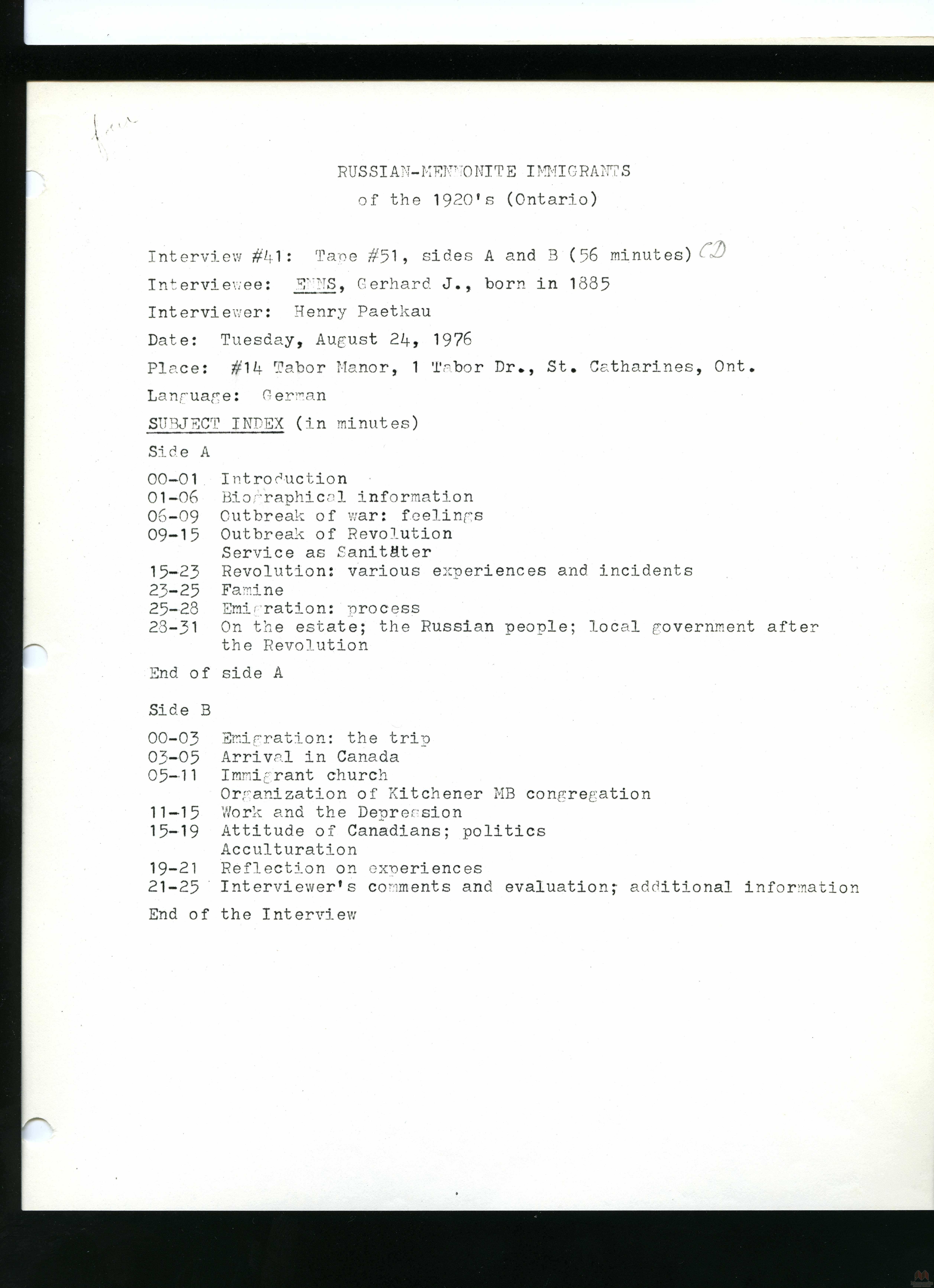 Keywords Mennonite, Russia, Russian, emigration, interview, oral, history, immigration, immigrants, Canada, Ontario, 1920s, transcript, Gerhard J. Enns,