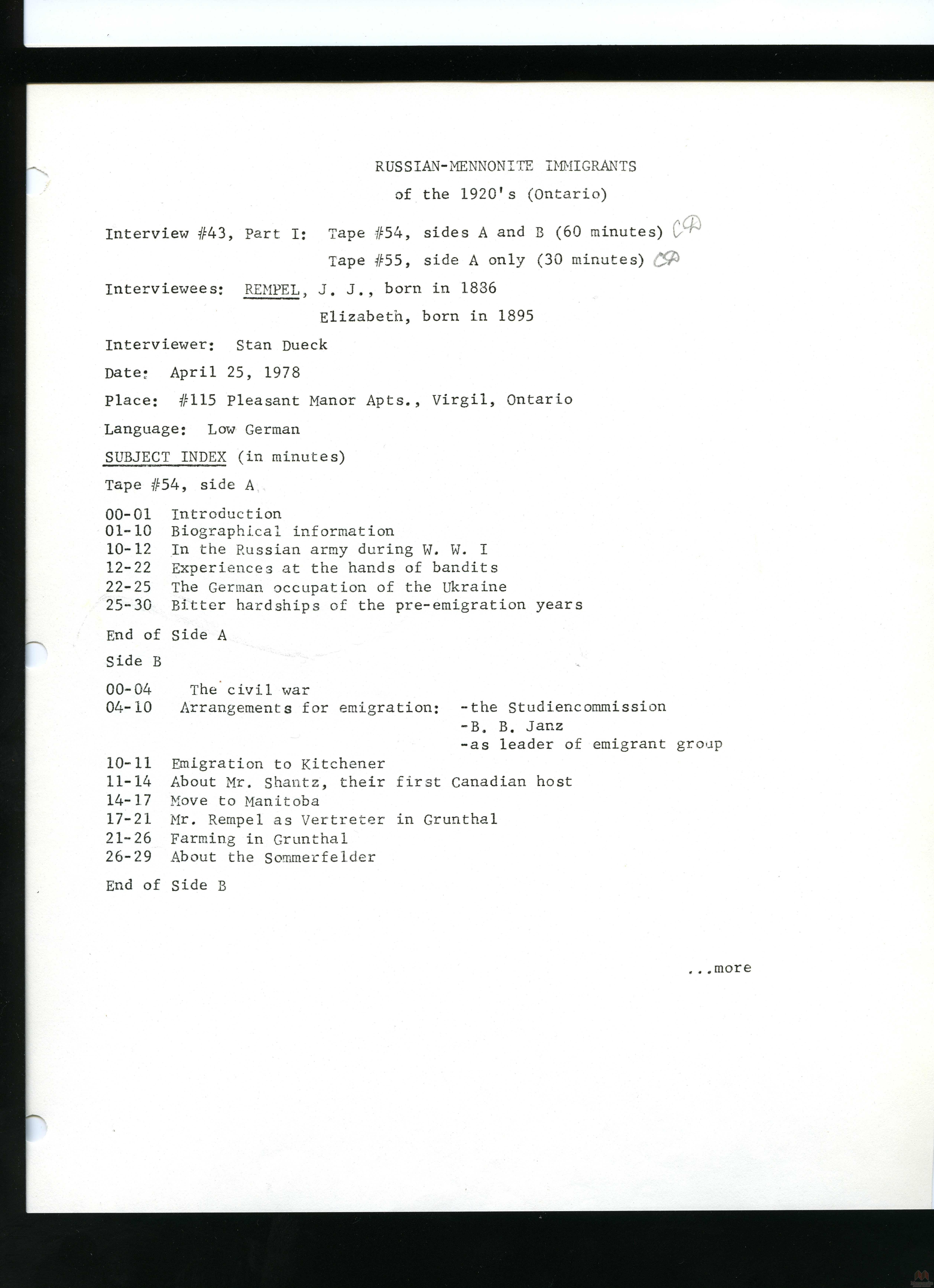 Keywords Mennonite, Russia, Russian, emigration, interview, oral, history, immigration, immigrants, Canada, Ontario, 1920s, transcript, J.J. Rempel, Elizabeth Rempel,