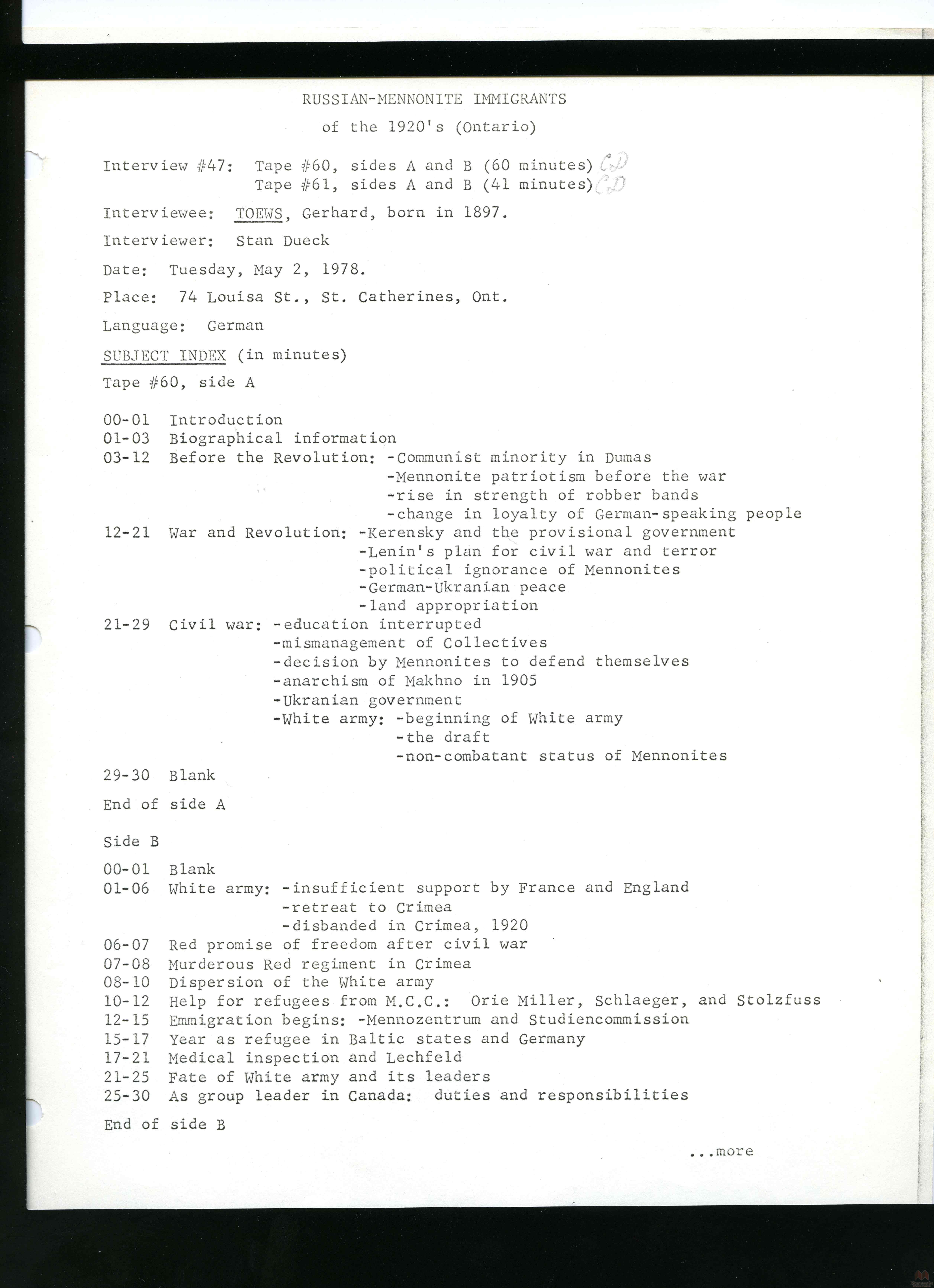 Keywords Mennonite, Russia, Russian, emigration, interview, oral, history, immigration, immigrants, Canada, Ontario, 1920s, transcript, Gerhard Toews,