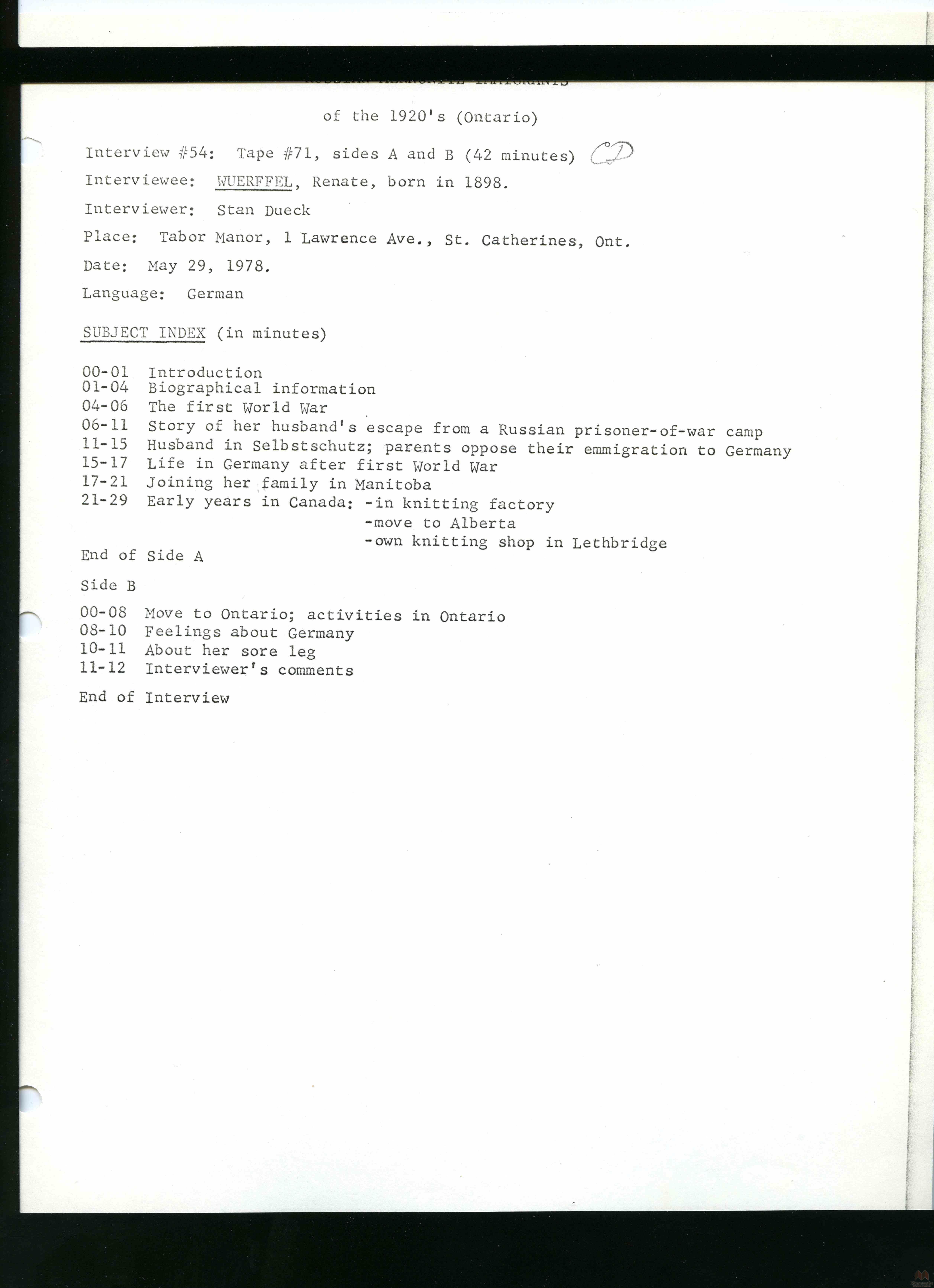 Keywords Mennonite, Russia, Russian, emigration, interview, oral, history, immigration, immigrants, Canada, Ontario, 1920s, transcript, Renate Wuerffel,