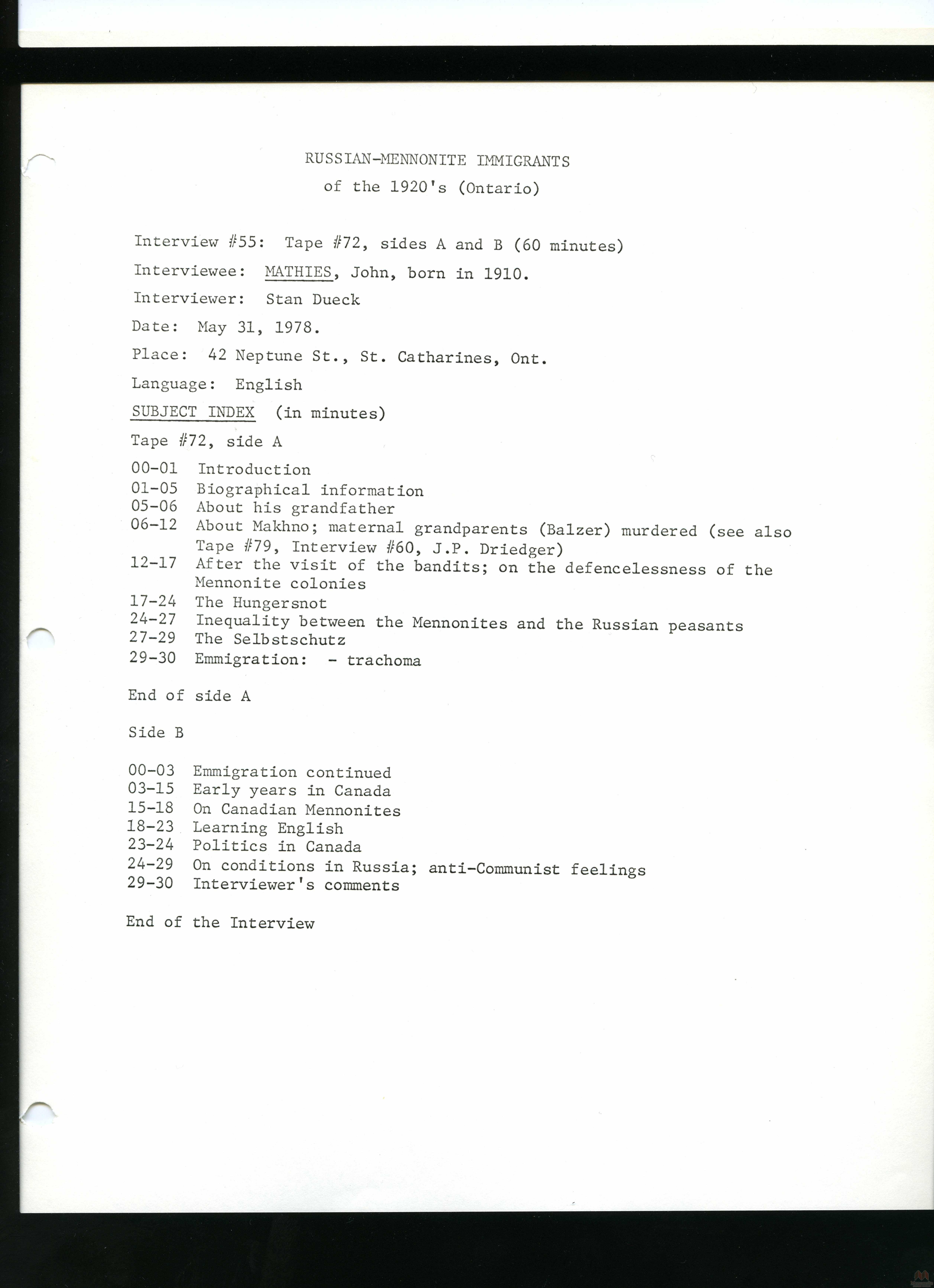 Keywords John Mathies, Mennonite, Russia, Russian, emigration, interview, oral, history, immigration, immigrants, Canada, Ontario, 1920s, transcript,