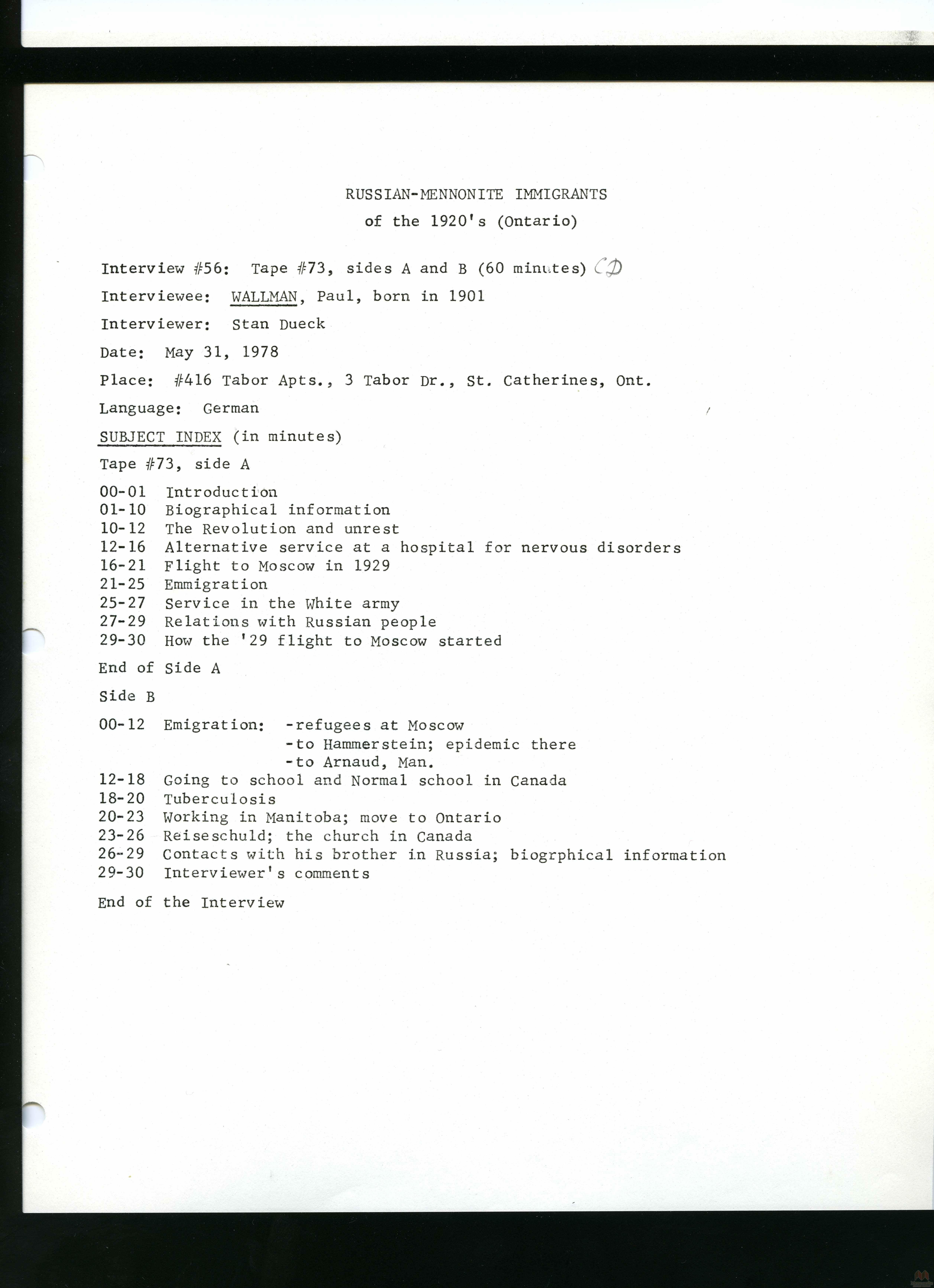 Keywords Mennonite, Russia, Russian, emigration, interview, oral, history, immigration, immigrants, Canada, Ontario, 1920s, transcript, Paul Wallman,