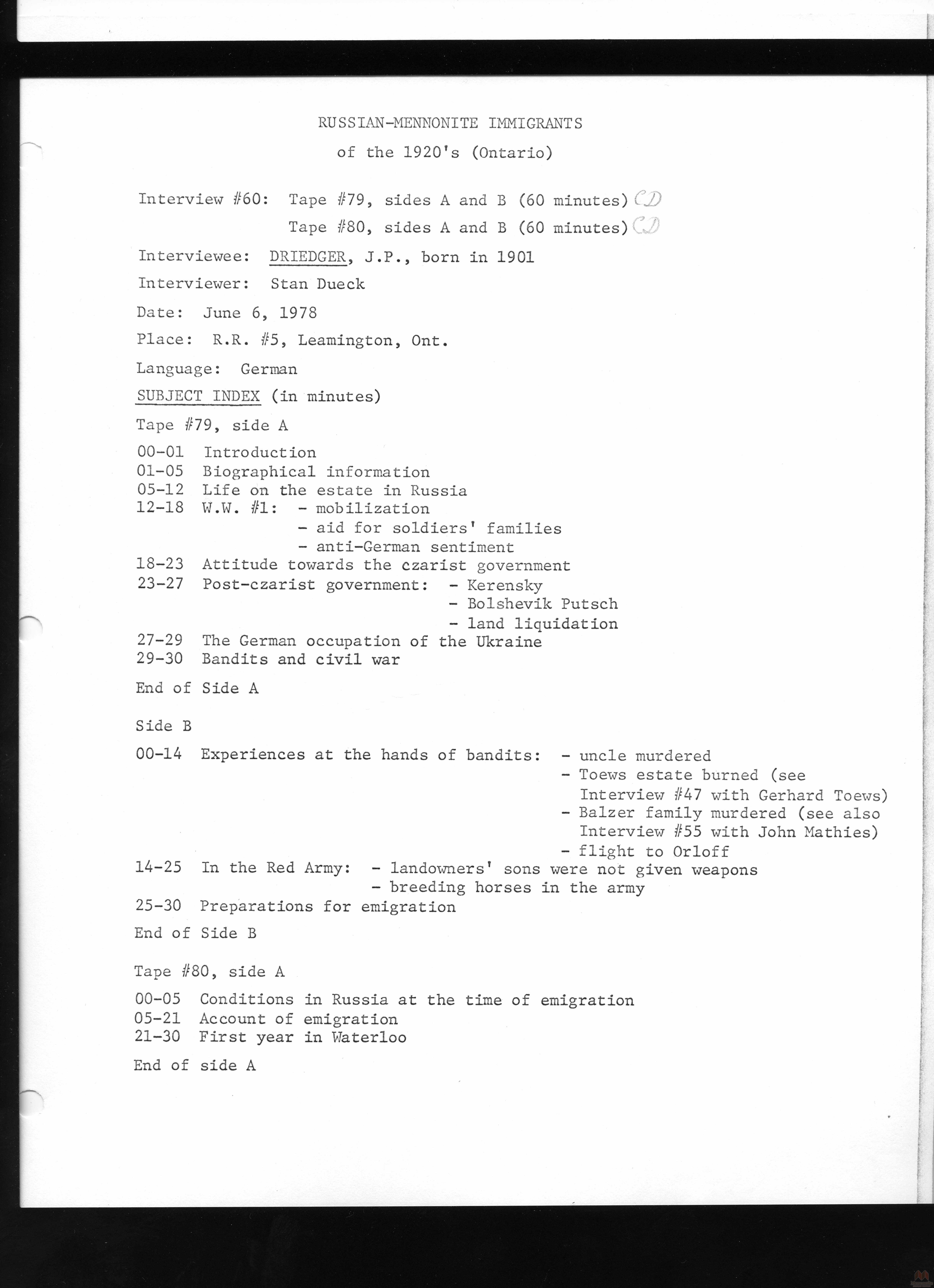 Keywords Mennonite, Russia, Russian, emigration, interview, oral, history, immigration, immigrants, Canada, Ontario, 1920s, transcript, J.P. Driedger,