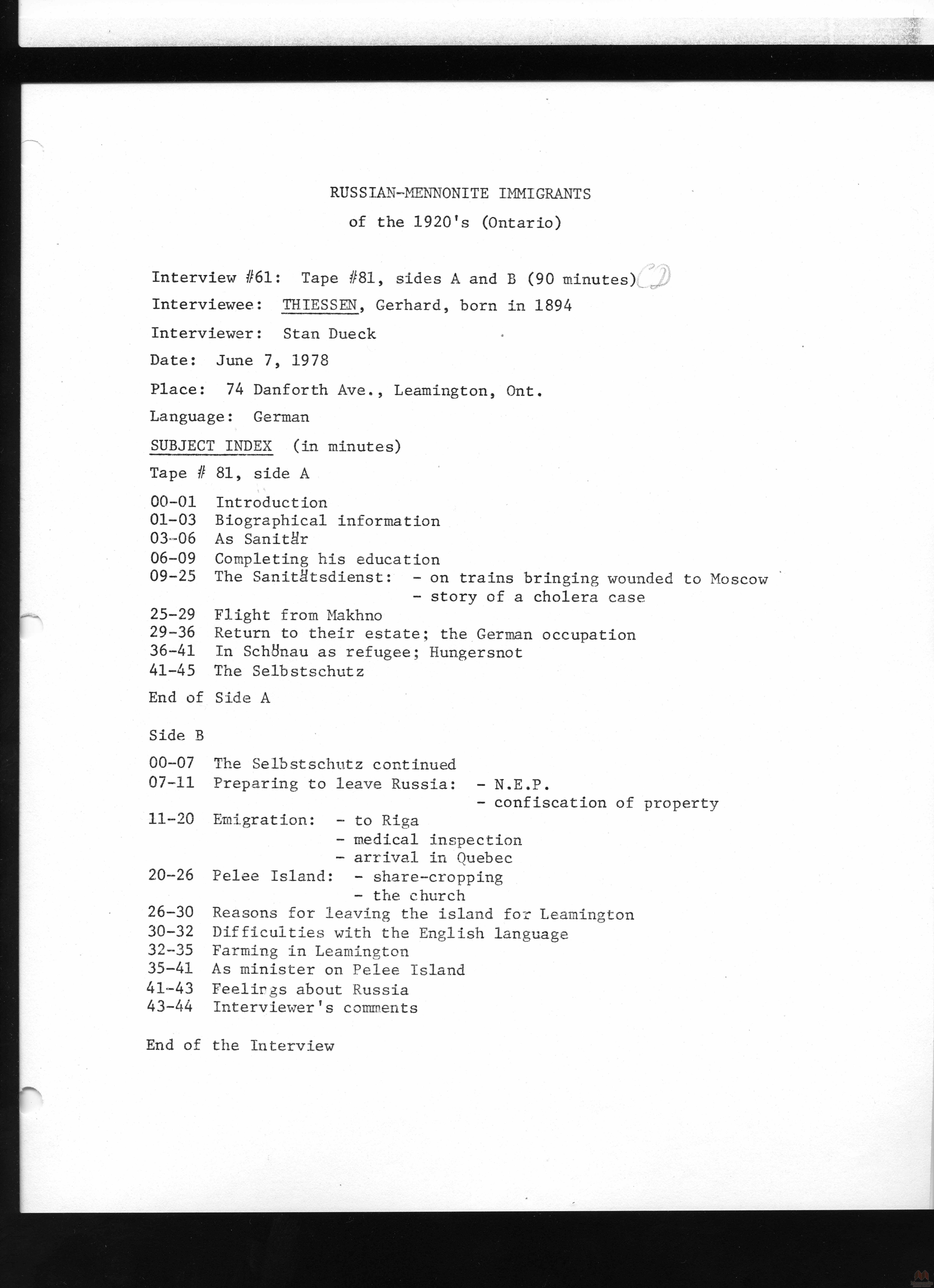 Keywords Mennonite, Russia, Russian, emigration, interview, oral, history, immigration, immigrants, Canada, Ontario, 1920s, transcript, Gerhard Thiessen