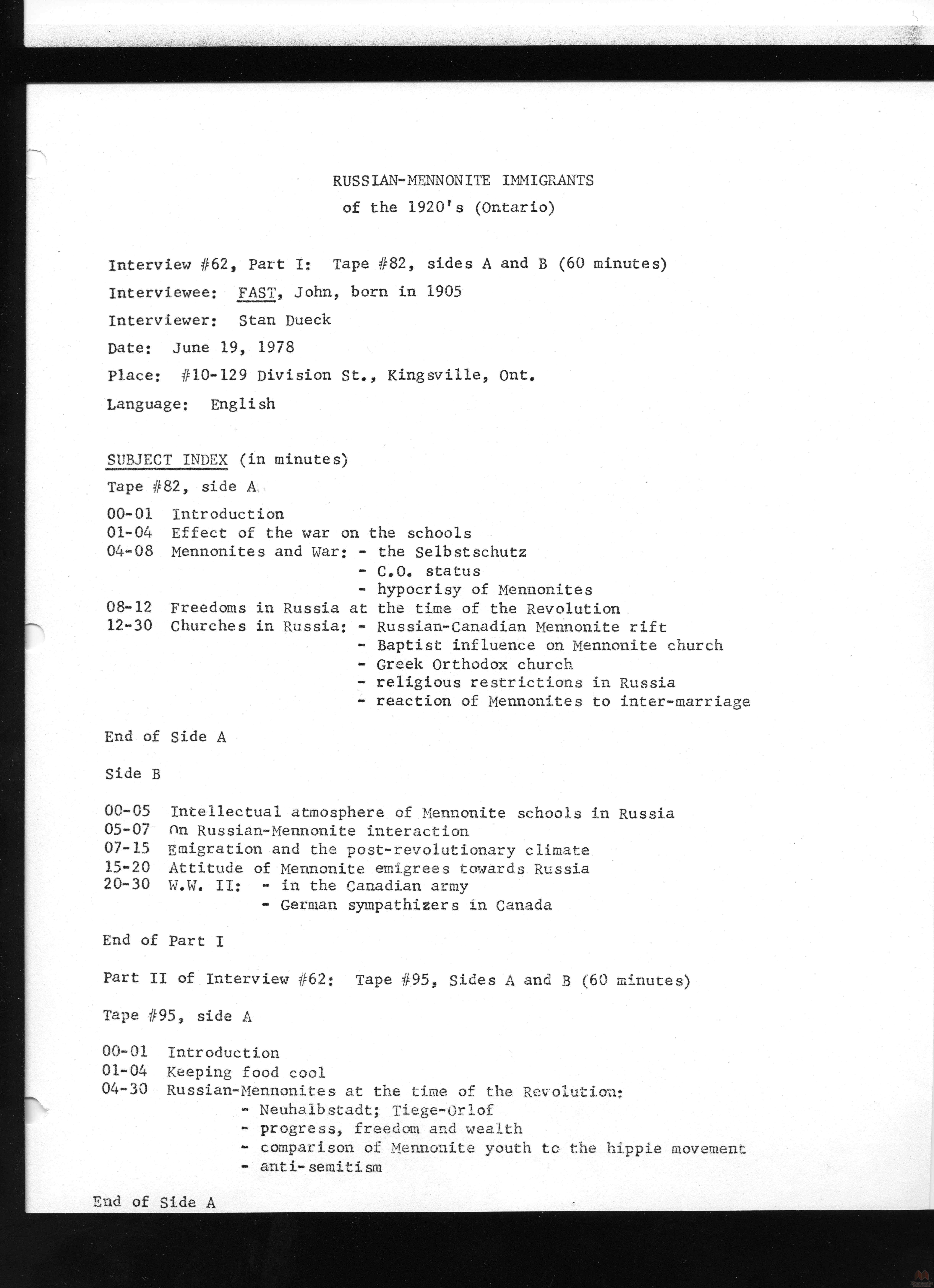 Keywords Mennonite, Russia, Russian, emigration, interview, oral, history, immigration, immigrants, Canada, Ontario, 1920s, transcript, John Fast,