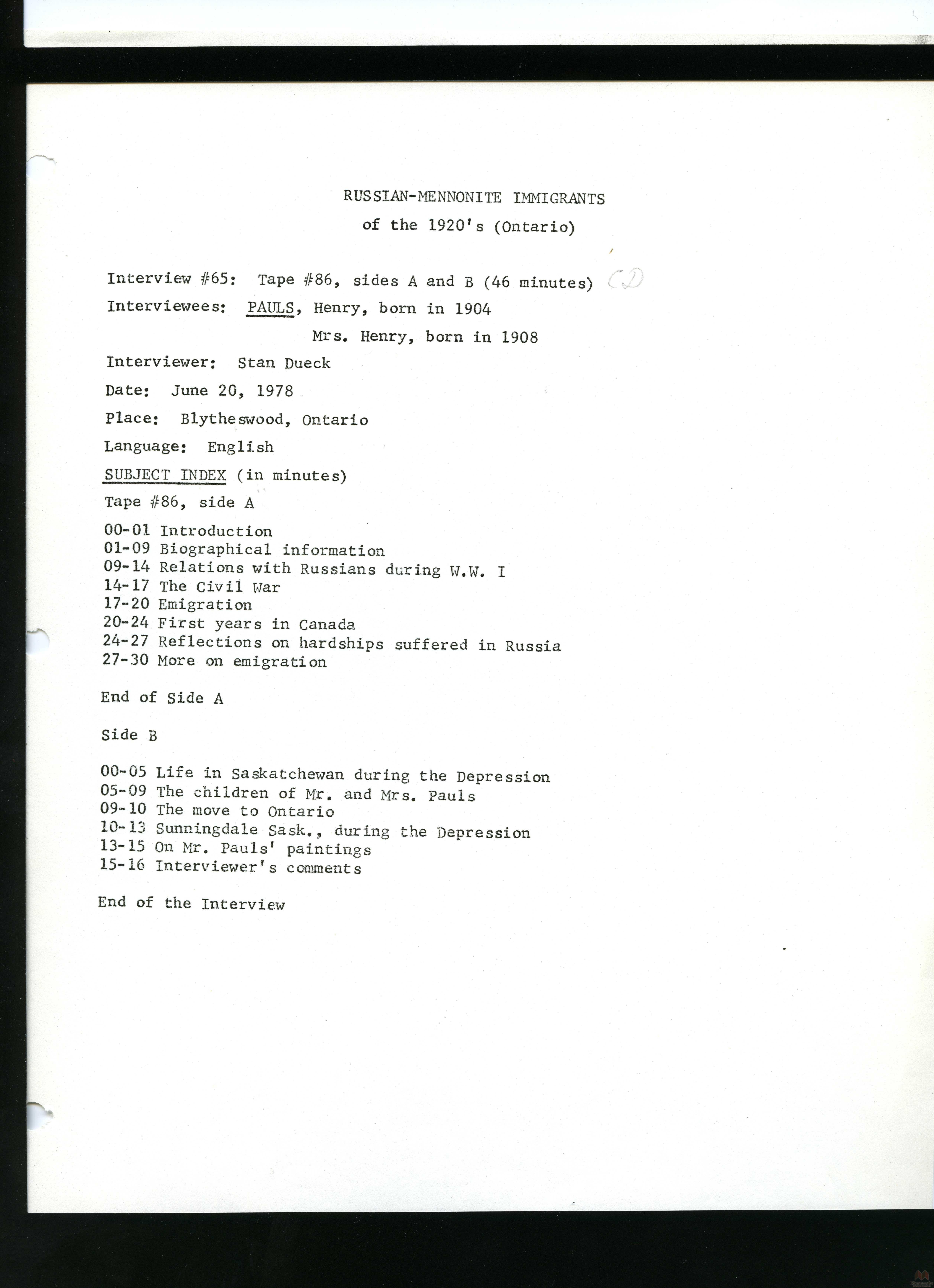 Keywords Mennonite, Russia, Russian, emigration, interview, oral, history, immigration, immigrants, Canada, Ontario, 1920s, transcript, Henry Pauls, Mrs. Pauls,
