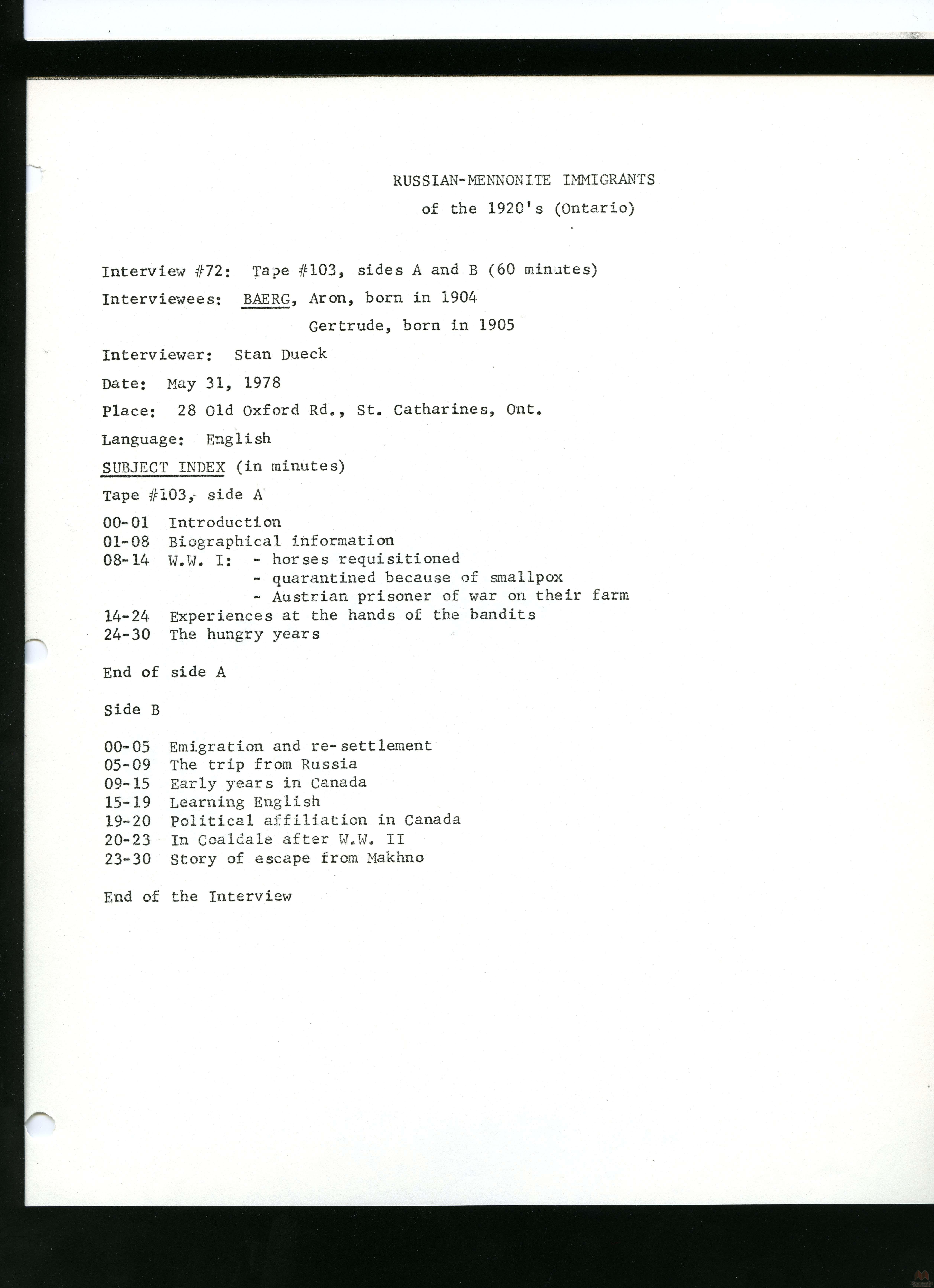 Keywords Mennonite, Russia, Russian, emigration, interview, oral, history, immigration, immigrants, Canada, Ontario, 1920s, transcript, Gertrude Baerg, Aron Baerg,