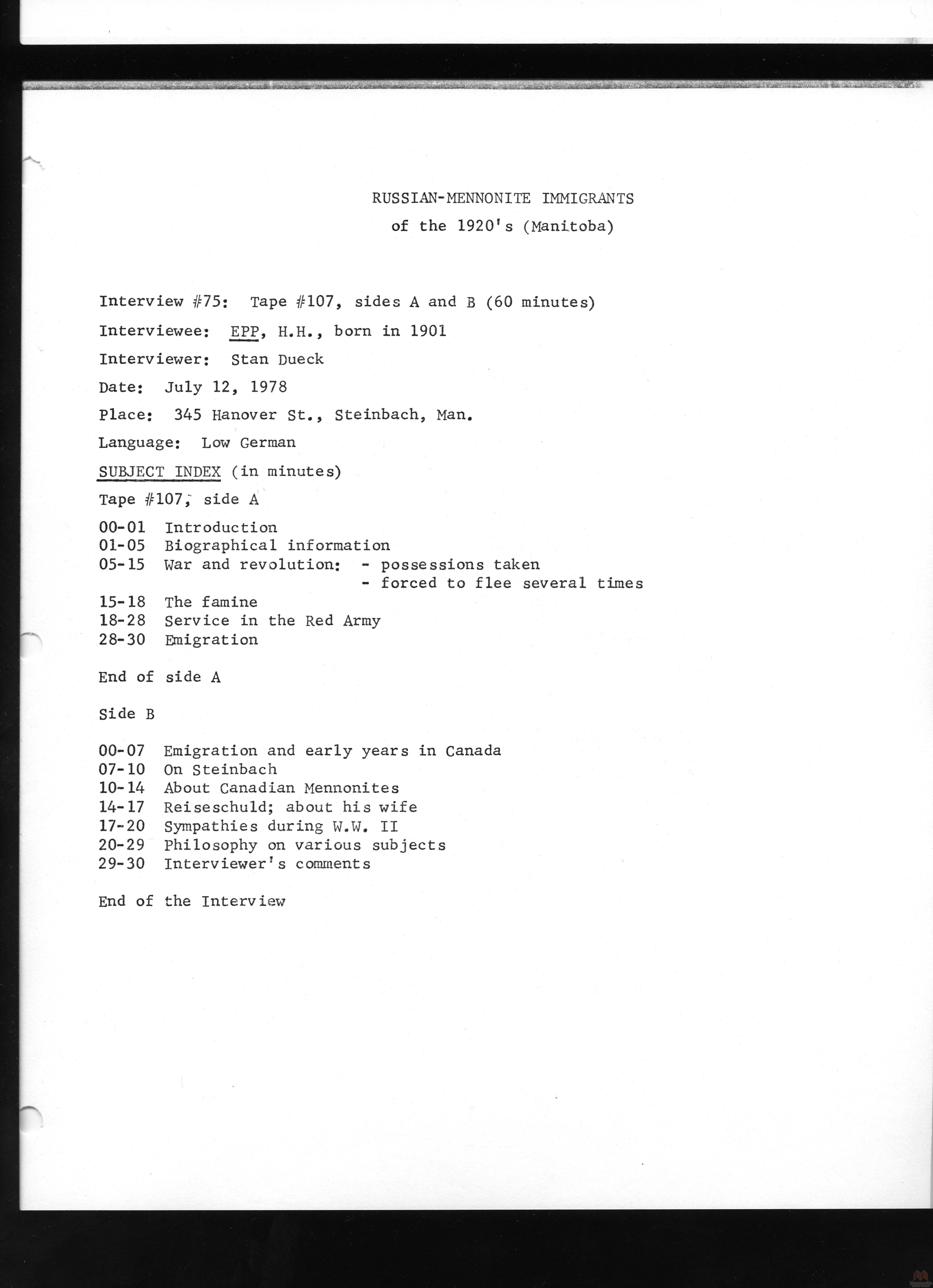 Keywords Mennonite, Russia, Russian, emigration, interview, oral, history, immigration, immigrants, Canada, Ontario, 1920s, transcript, H.H Epp,