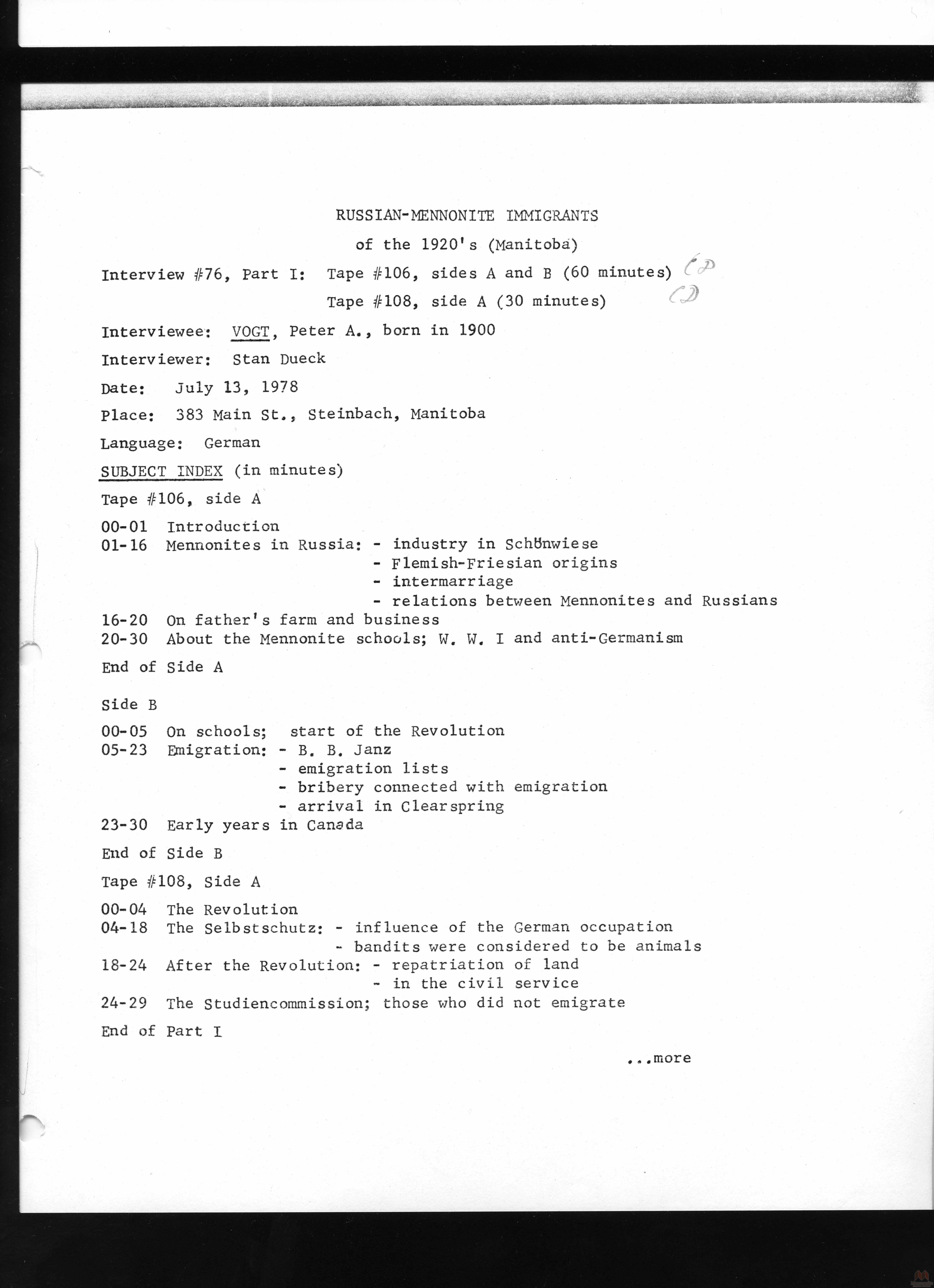 Keywords Mennonite, Russia, Russian, emigration, interview, oral, history, immigration, immigrants, Canada, Ontario, 1920s, transcript, Peter A. Vogt,