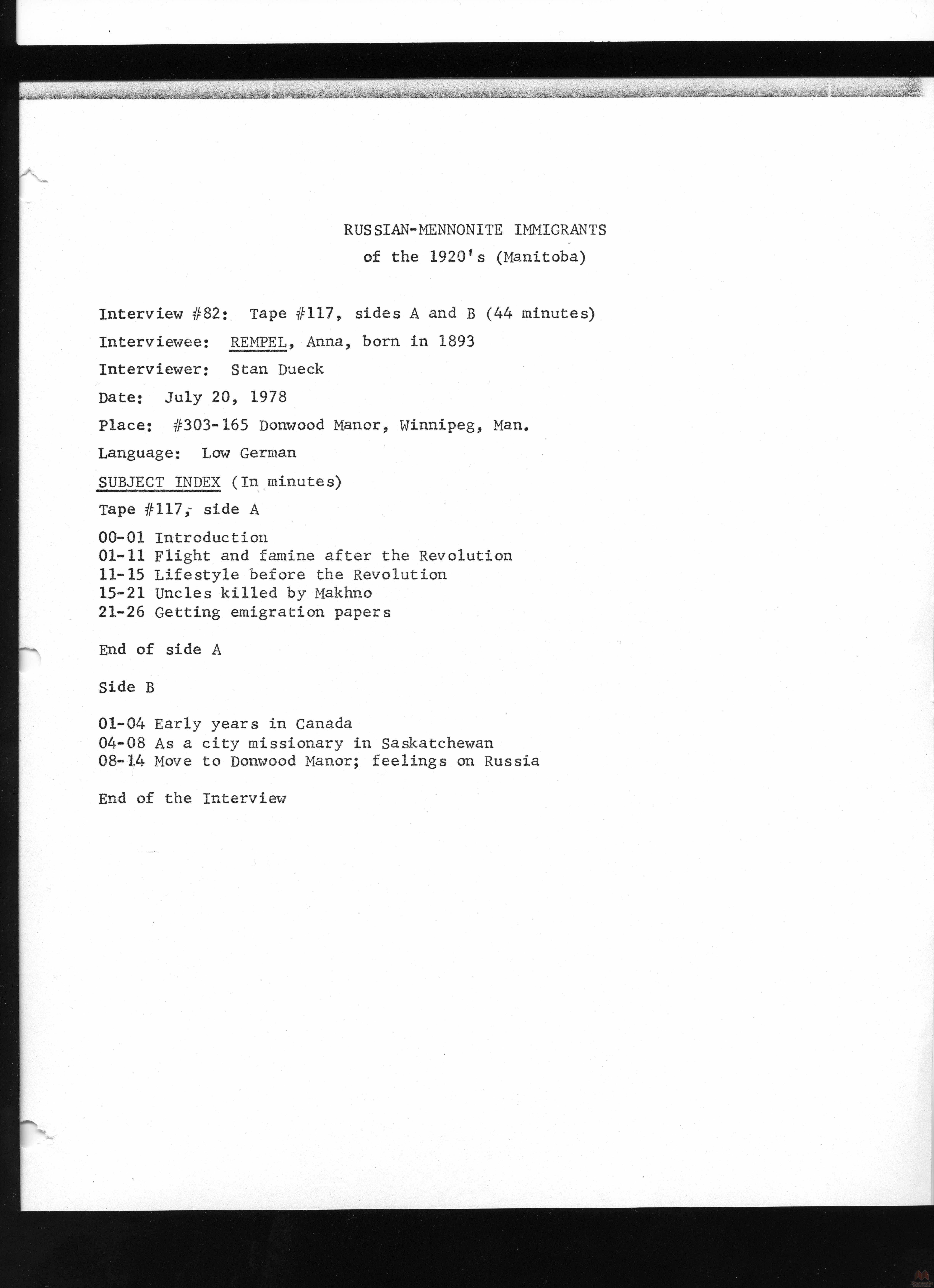 Keywords Anna Rempel, Mennonite, Russia, Russian, emigration, interview, oral, history, immigration, immigrants, Canada, Ontario, 1920s, transcript,