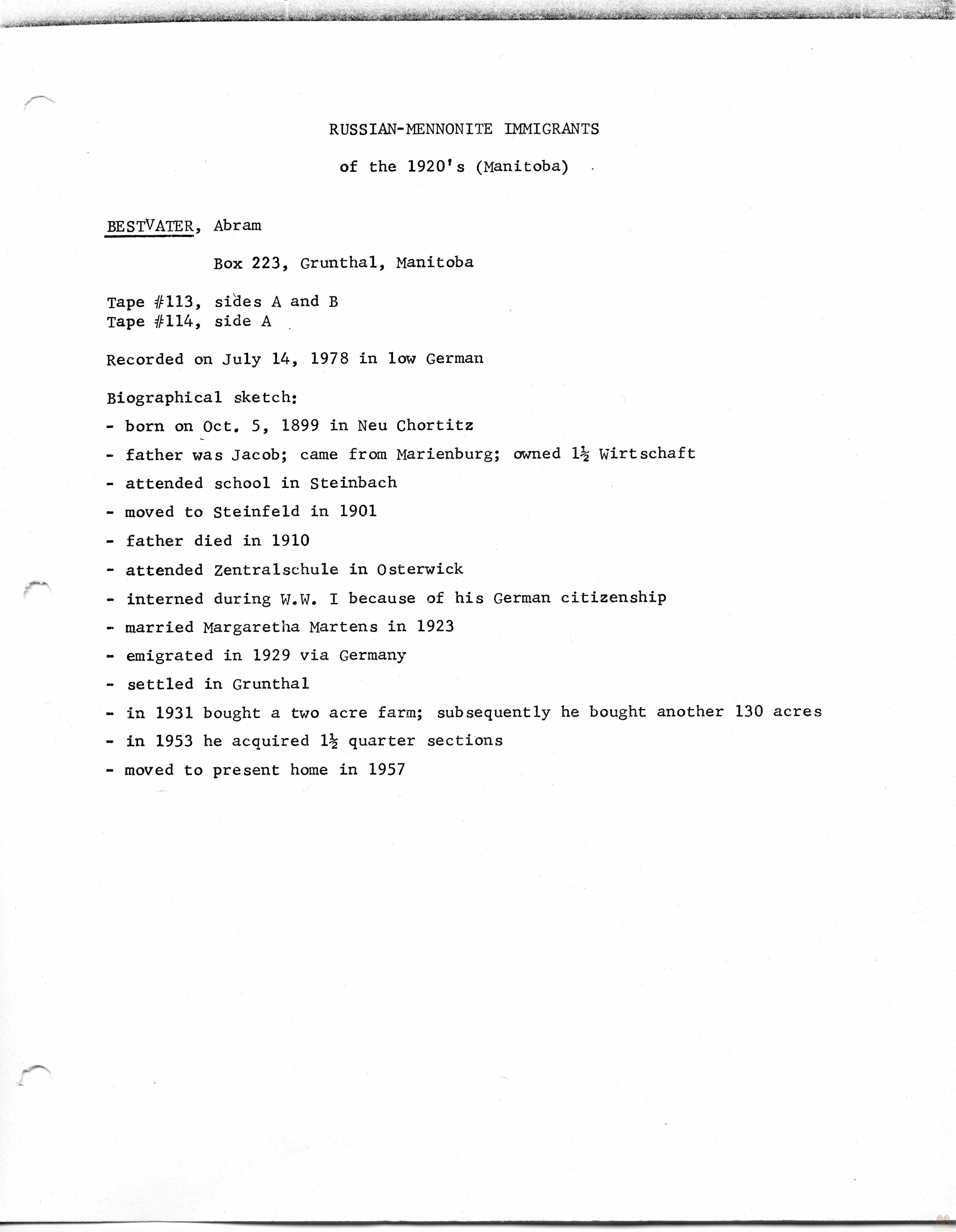 Keywords Mennonite, Russia, Russian, emigration, interview, oral, history, immigration, immigrants, Canada, Ontario, 1920s, transcript, biography, Abram Bestvater,