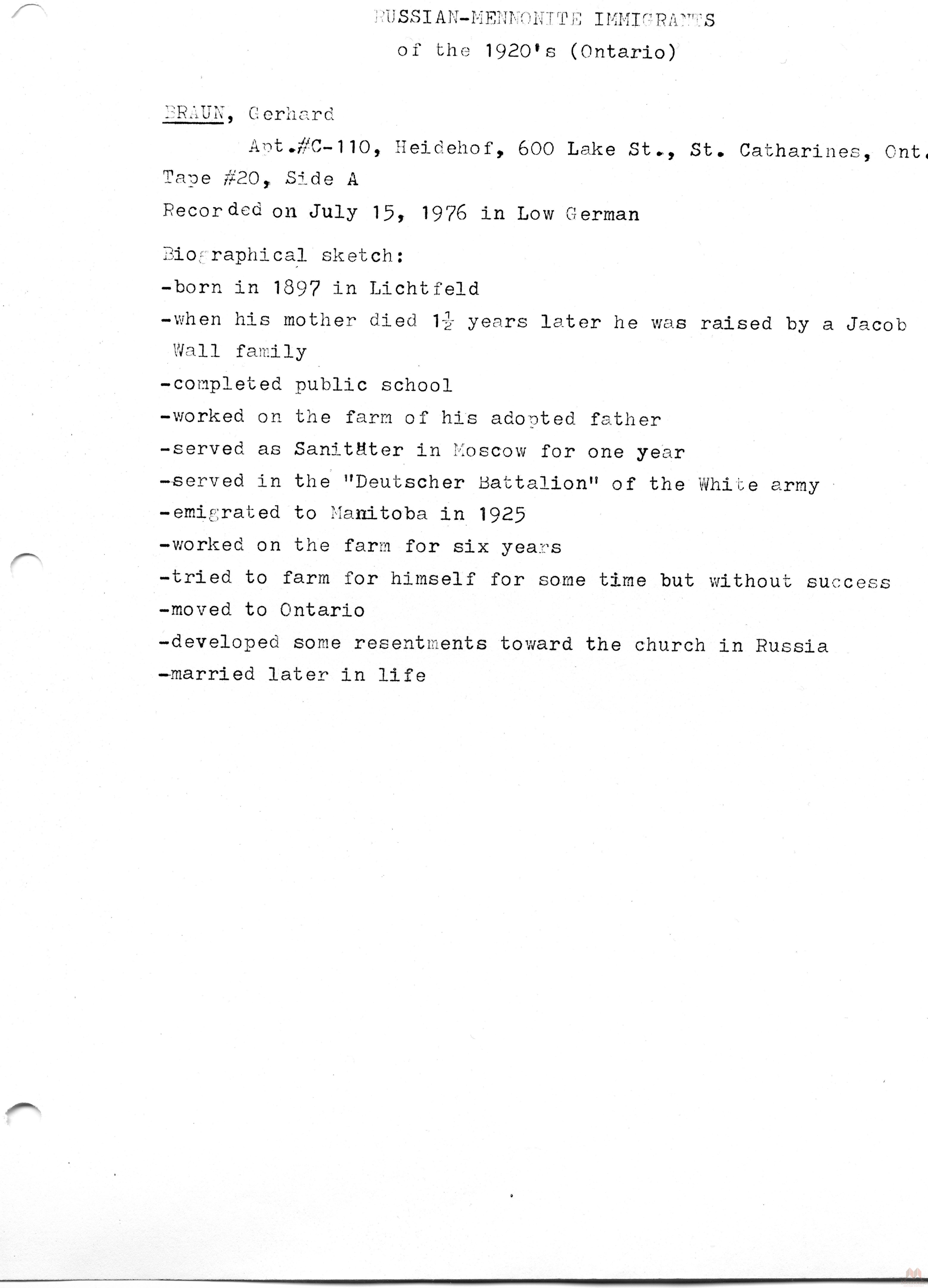 Keywords Mennonite, Russia, Russian, emigration, interview, oral, history, immigration, immigrants, Canada, Ontario, 1920s, transcript, biography, Gerhard Braun,